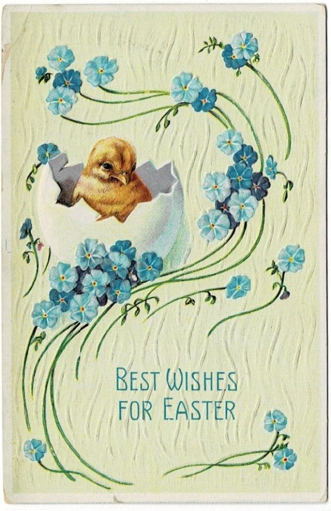 1910 vintage postcard. An adorable yellow baby chick sits cradled inside a half-shell. It is surrounded by blooming blue Forget-Me-Not flowers. The background of the card has subtle embossed blades of grass. "Best Wishes for Easter" greeting. This vintage postcard would look great framed as a holiday memento, placed in an Easter basket, or added to any collection.