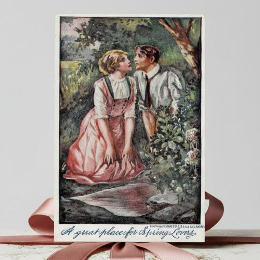 1910 vintage postcard. "A Great Place For Spring Lovers" An adoring couple refreshes themselves by a natural spring. A sweet, romantic vignette with a cute play on words. This vintage postcard would look great framed or make an excellent addition to any collection.