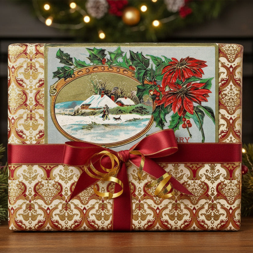Decorative Christmas gift box with 1910 Walking Dog in Snow Antique Vintage Christmas Postcard Card.