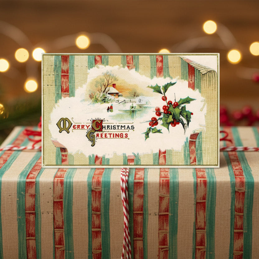 The scene is framed by festive holly berries and leaves, with the words “Merry Christmas Greetings” rendered in illuminated script lettering that harkens back to a bygone era. The card’s gilded accents and embossed details add a touch of luxury, making it an enchanting piece of holiday history to cherish and share.