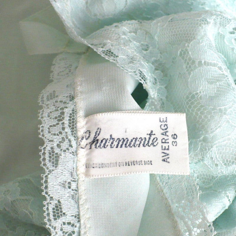 Add a touch of vintage femininity to your lingerie collection with this stunning 1960s lace-topped cami-slip, in a refreshing mint green, reminiscent of soft sherbet or pastel spring hues. Featuring a princess-lined bodice for a flattering fit, the delicate lace-covered bodice and hem create a timelessly romantic look. The V-neckline and straight back of this stunning full slip create a classic silhouette, while the adjustable satin ribbon straps offer a customizable fit for ultimate comfort.