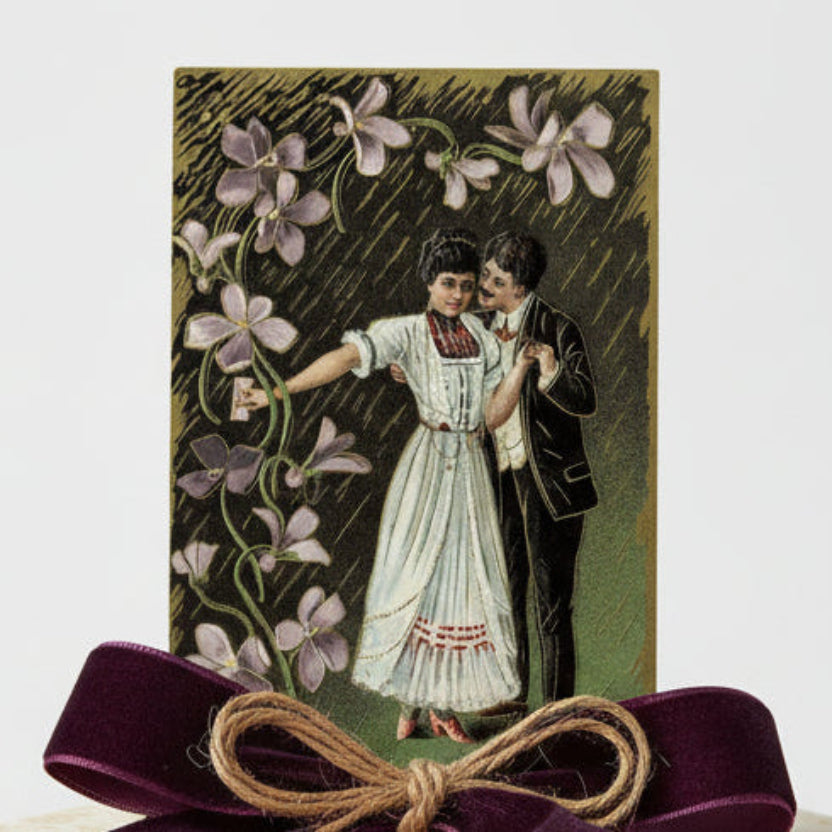 This 1908 vintage postcard captures a tender moment between an Edwardian lady and a gentleman. The lady, dressed in a lovely white lawn dress, is held gently from the side by a handlebar-mustached gentleman who whispers sweet nothings into her ear. She stretches her other arm out away from him, holding an envelope decorated with violets. The postcard is adorned with gilded accents, adding to its charm.