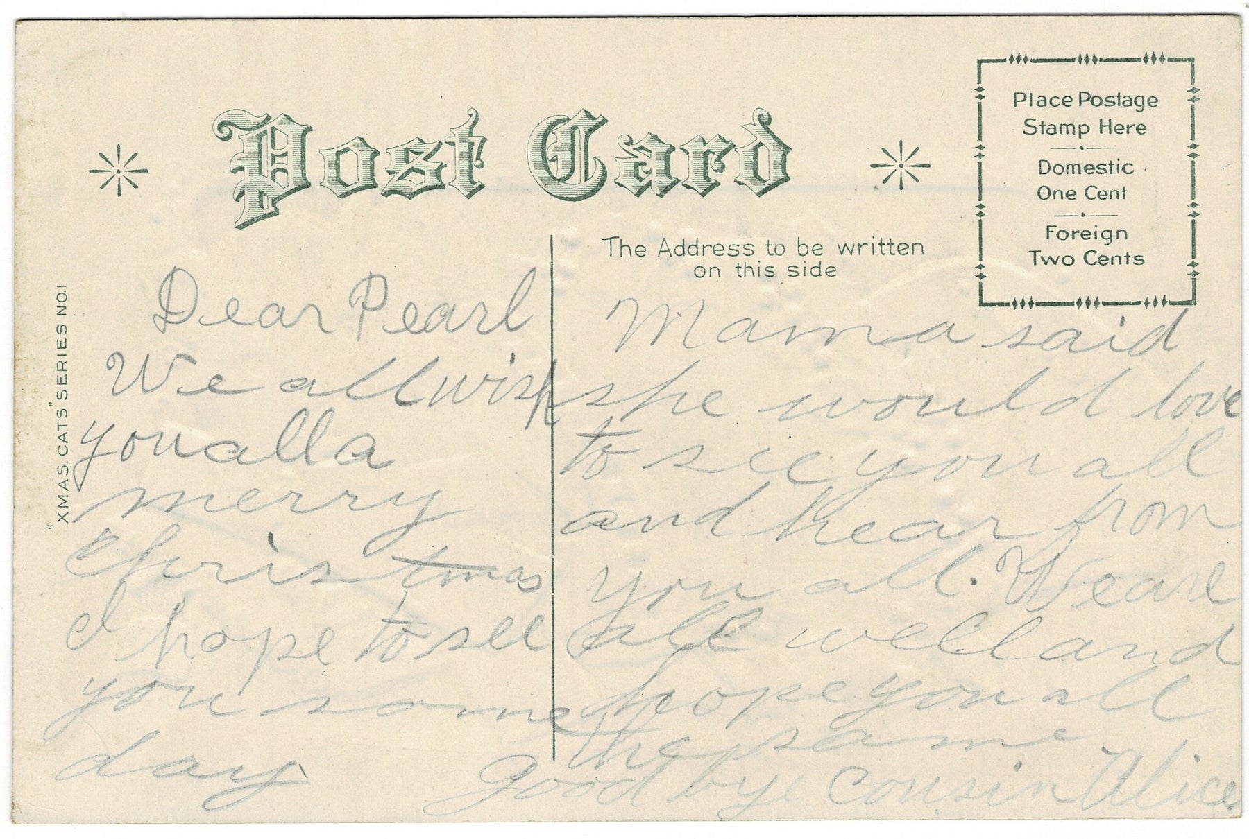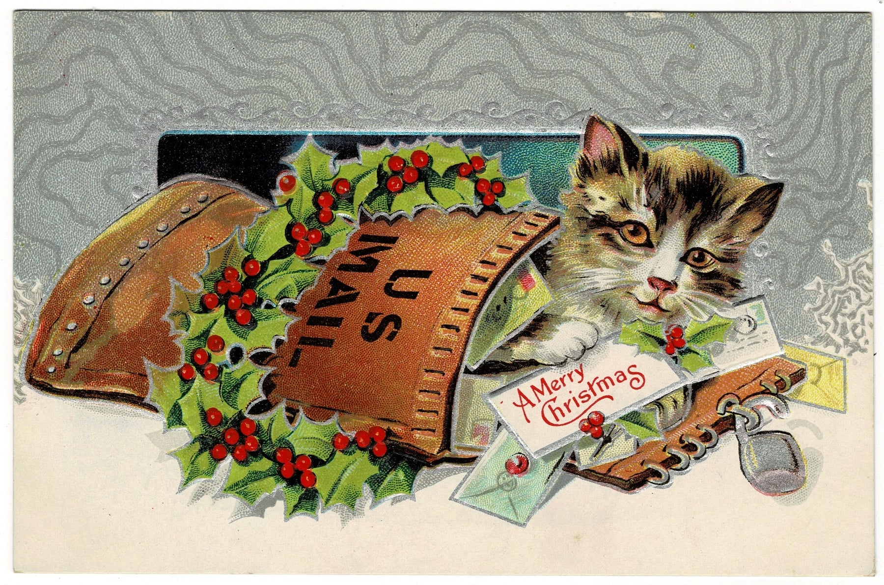 Step back into a simpler time when holiday cheer arrived by post and every letter was a treasure. This charming 1912 embossed and gilded Christmas postcard captures that spirit perfectly, featuring a wide-eyed tabby kitten nestled inside a U.S. Mail carrier’s worn leather bag. The bag, lovingly detailed with holly leaves and berries, spills over with festive envelopes—one sweetly marked “A Merry Christmas.” The textured gray background and delicate white accents lend the scene a quiet, snowy-day feeling, like something found tucked in a trunk of family keepsakes. The kitten’s curious gaze draws you in, a gentle reminder of the warmth and wonder of holiday surprises.