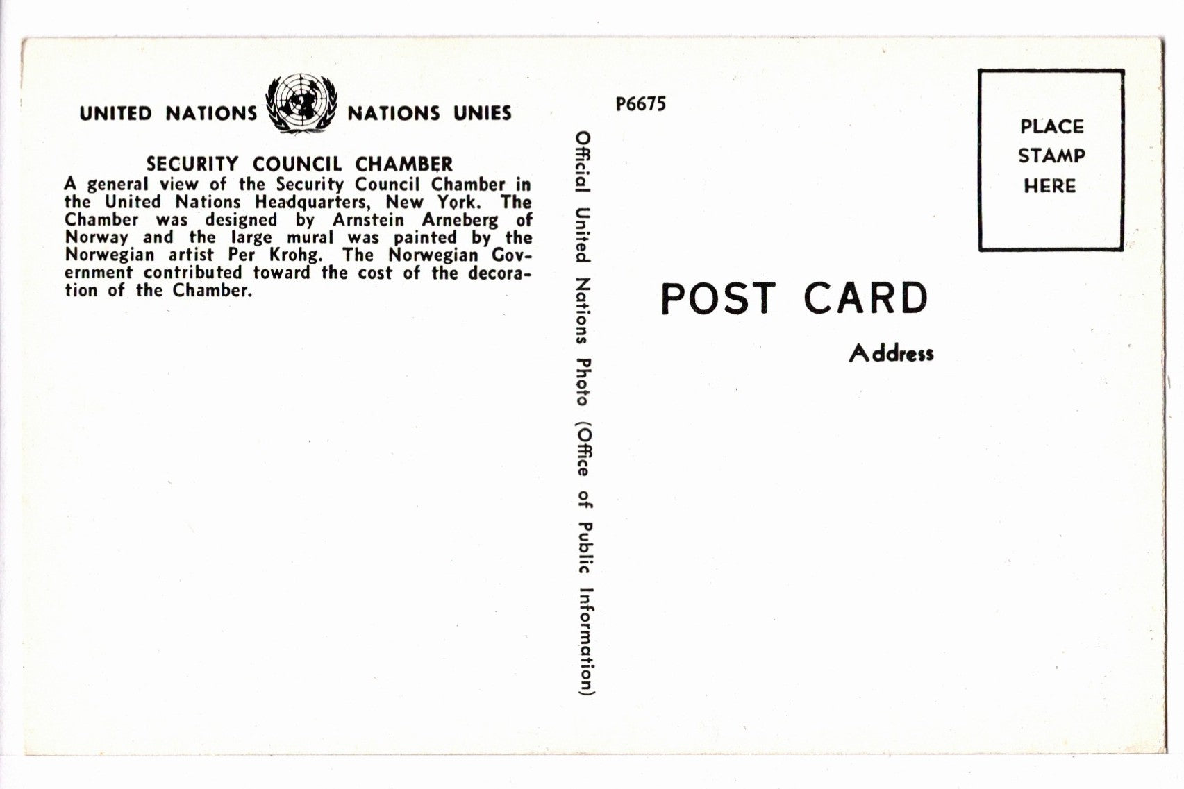 This vintage postcard captures the United Nations Security Council Chamber, a room steeped in history and international diplomacy. The chamber was a gift from Norway and officially opened in 1952. Norwegian architect Arnstein Arneberg designed the space, and the interiors, including chairs and furnishings, were provided by Norway. The centerpiece of the room is the massive horseshoe-shaped table around which council members sit facing one another to discuss matters of global peace and security.