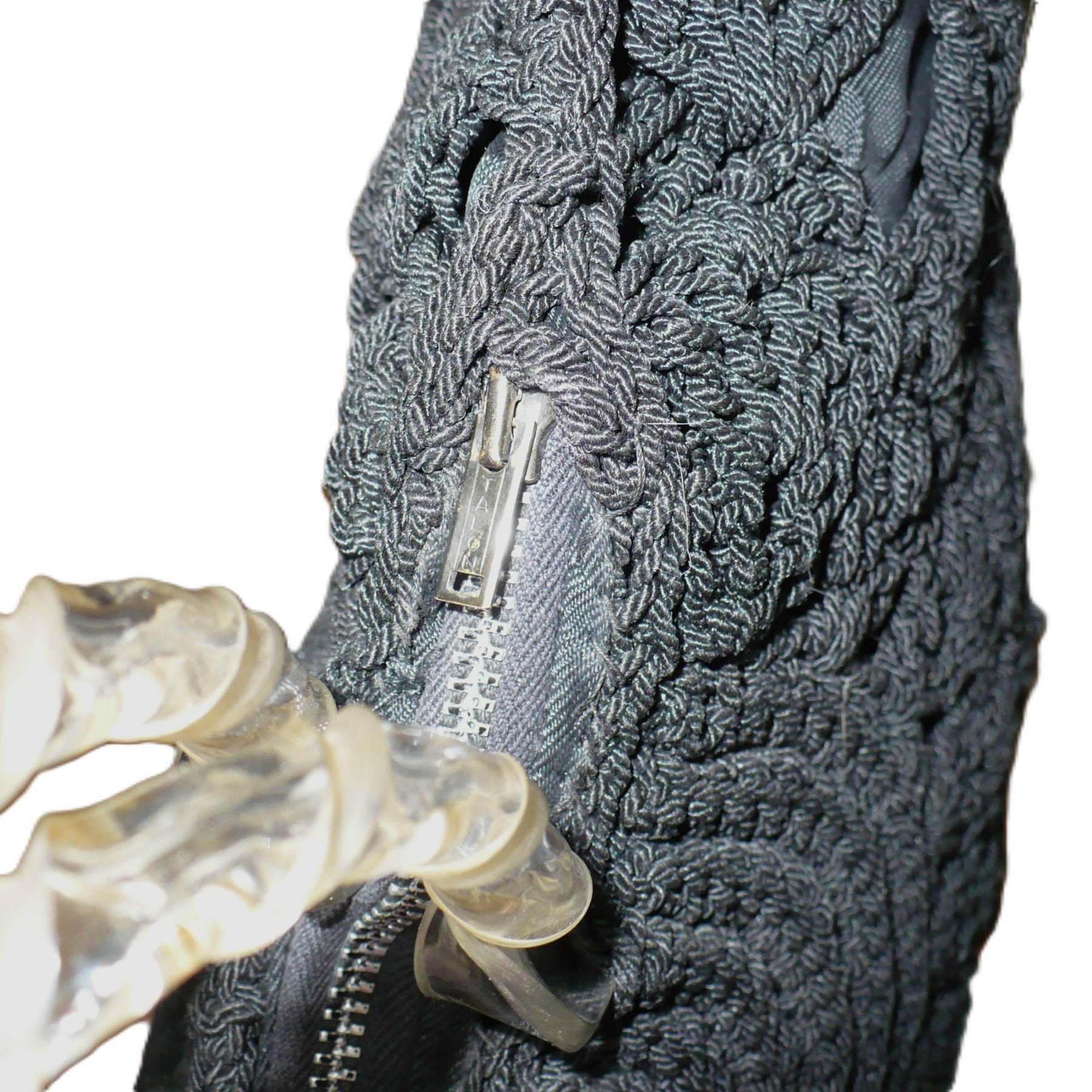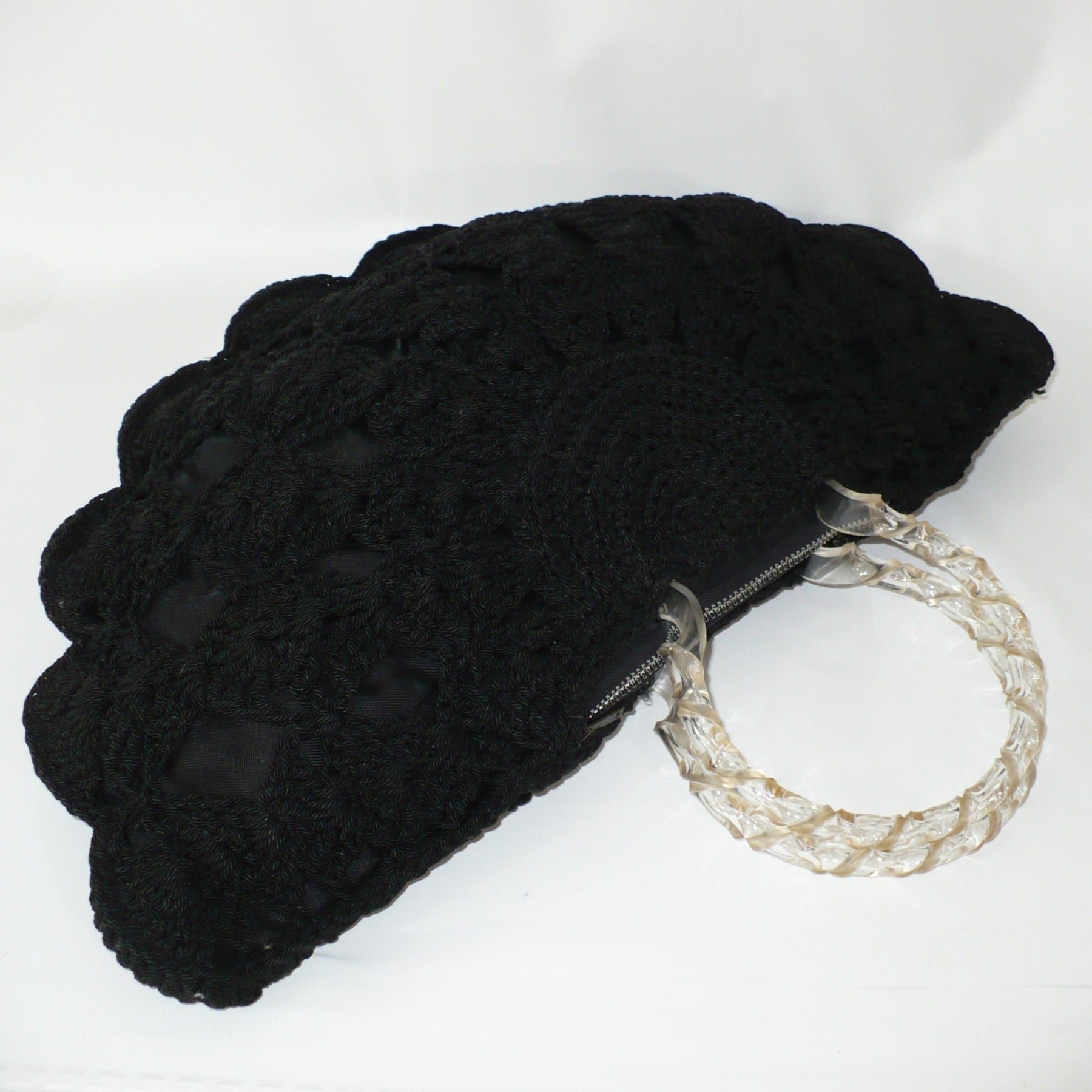 This exquisite 1940s wartime black soutache handbag is a true testament to the creativity and ingenuity of the World War II era. Made with black F&K Cordé thread, this intricately crocheted bag is lined with black cotton fabric and includes two inner compartments to help keep your belongings organized and easily accessible.