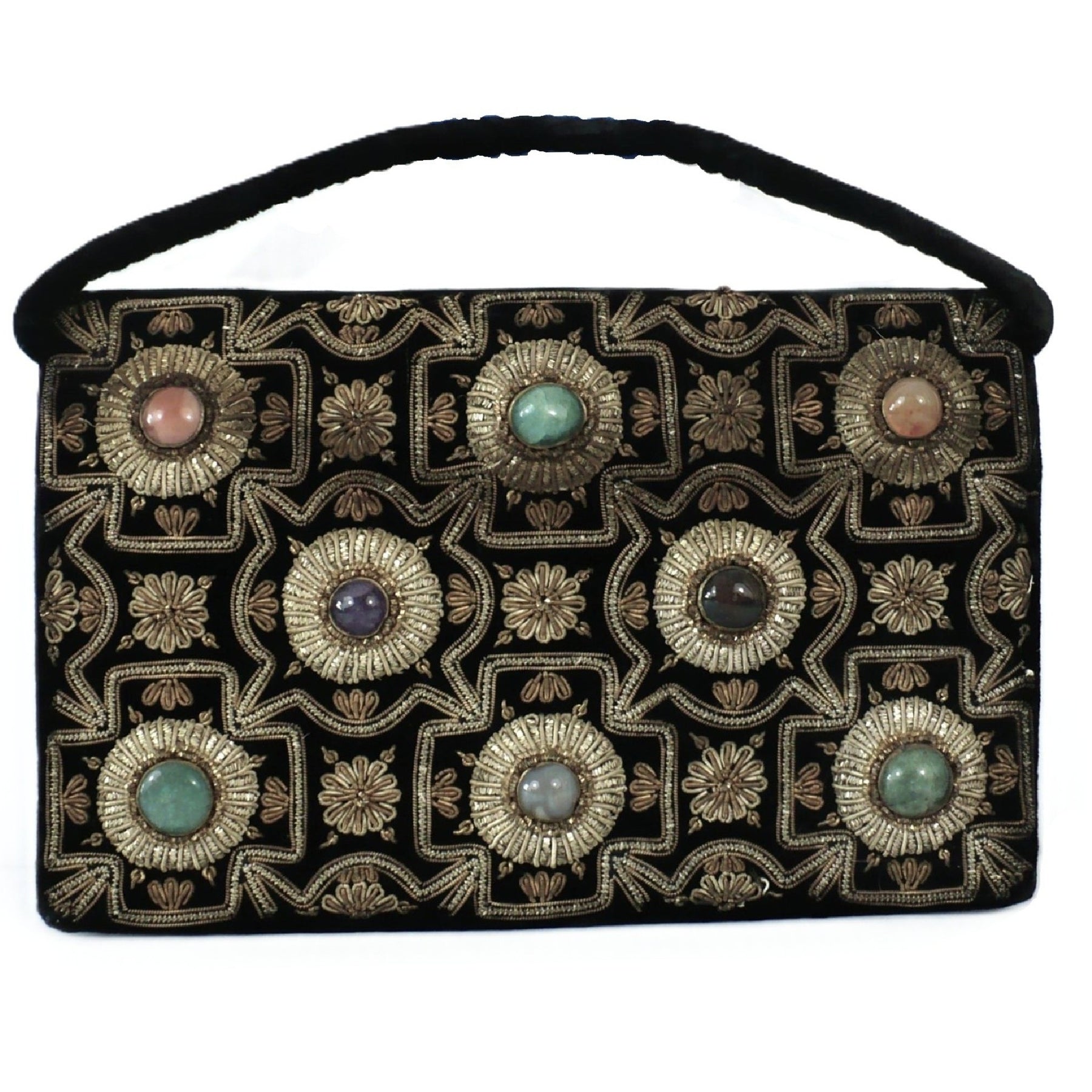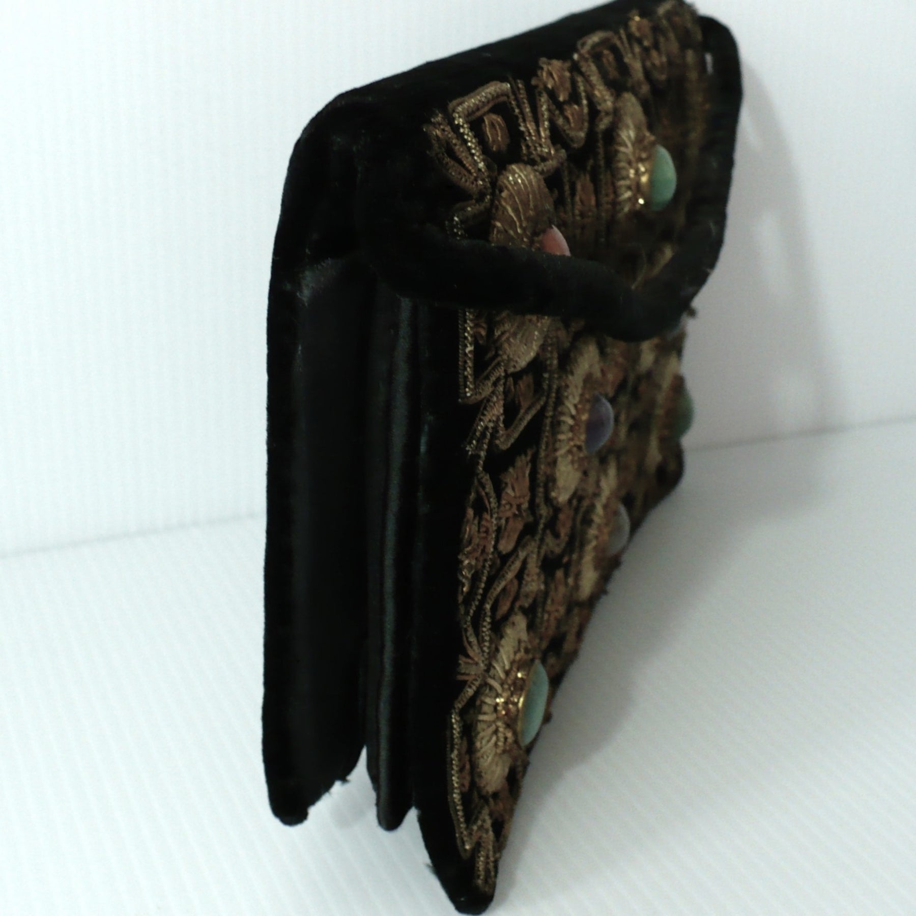 This stunning 1940s vintage clutch purse is a testament to the craftsmanship of Zardozi embroidery, a Persian art form that flourished in India during the Mughal era. The hand-applied gold and silver soutache embroidery forms intricate patterns adorned with beautiful gemstones such as agates, jadeite, amethyst, quartz, and carnelian. The slight tarnish on the silver detailing adds to the character of this cherished antique, showcasing its age and history.
