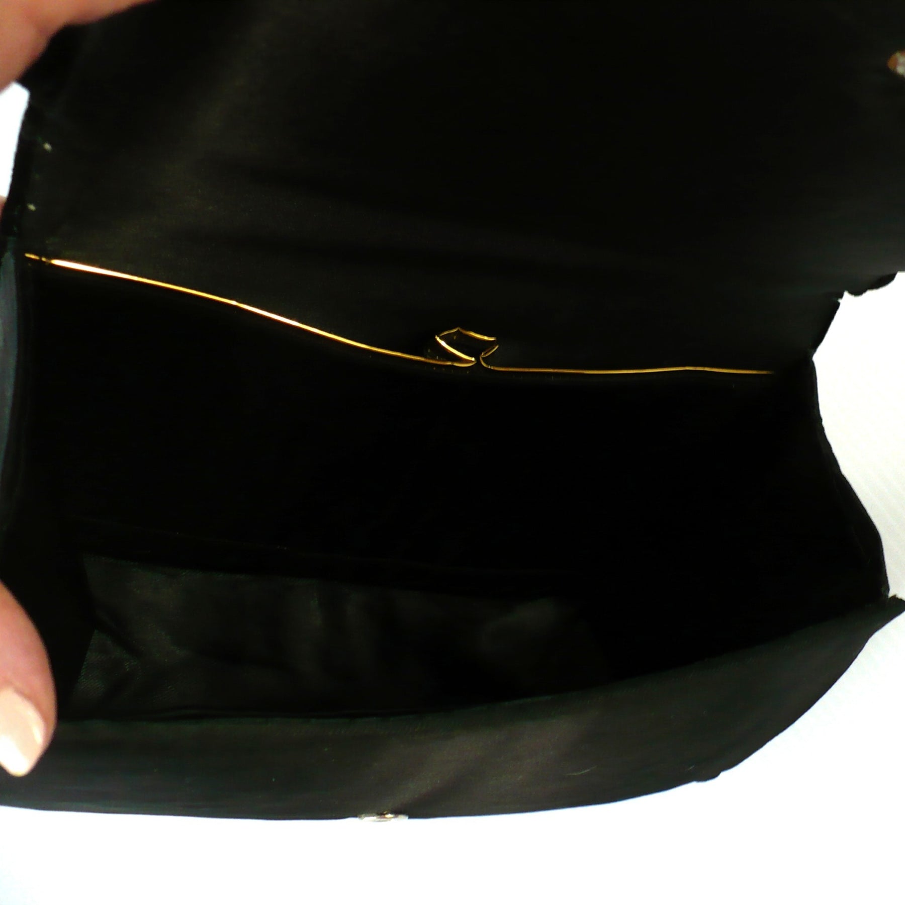 Crafted from black rayon velvet exterior and black plain weave rayon interior. The interior pockets are finished with pockets trimmed in gold Lamé fabric, while a hidden snap closure secures its contents. This purse embodies the "Anglo-Indian style" of the 1940s, which blended British tailoring with traditional Indian elements. This style was popular among the Anglo-Indian community—people of mixed British and Indian heritage—who navigated a cultural space between the colonial British elite and the broader Indian society. Fashion from this era often featured tailored British clothing, such as shirts and trousers, complemented by Indian embellishments like intricate embroidery, delicate lace, and accessories that merged Western and Indian influences, making this evening bag a perfect representation of that unique aesthetic.