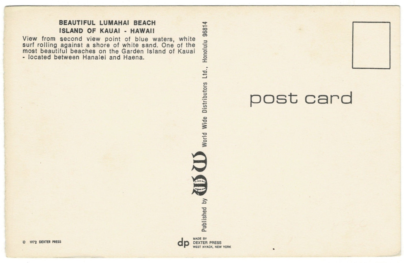 This postcard, officially copyrighted in 1972 by Dexter Press, captures a classic vantage point of Lumahai Beach, often cited as one of the most beautiful on the Garden Island. A notable historical detail is the red-and-yellow Hawaiian Warrior marker featured in the foreground. These iconic signs were first established by the Hawaii Tourist Bureau in 1932 to guide travelers to significant cultural and scenic landmarks. Lumahai Beach gained international fame as a primary filming location for the 1958 film South Pacific, immortalizing these shores as a symbol of tropical paradise,