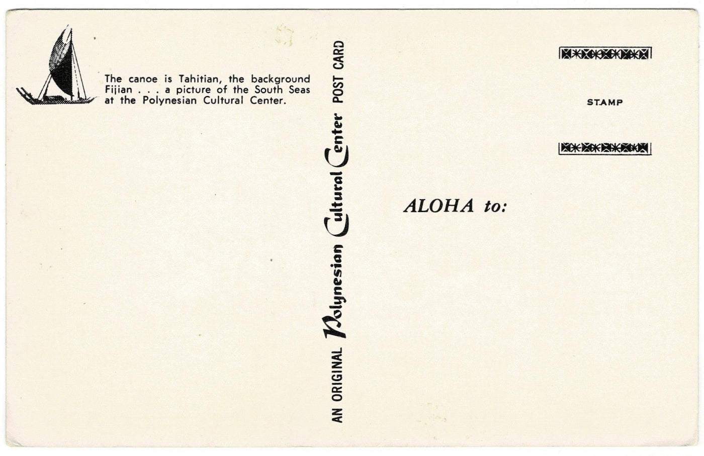 The Polynesian Cultural Center, established in 1963, was created to preserve and celebrate the distinct traditions, customs, and artistry of the Pacific Islands. This postcard offers a colorful snapshot of that vision. It is a living picture of the South Seas brought to life through performance, craftsmanship, and community. This vintage postcard would look great framed or make an excellent addition to any collection.