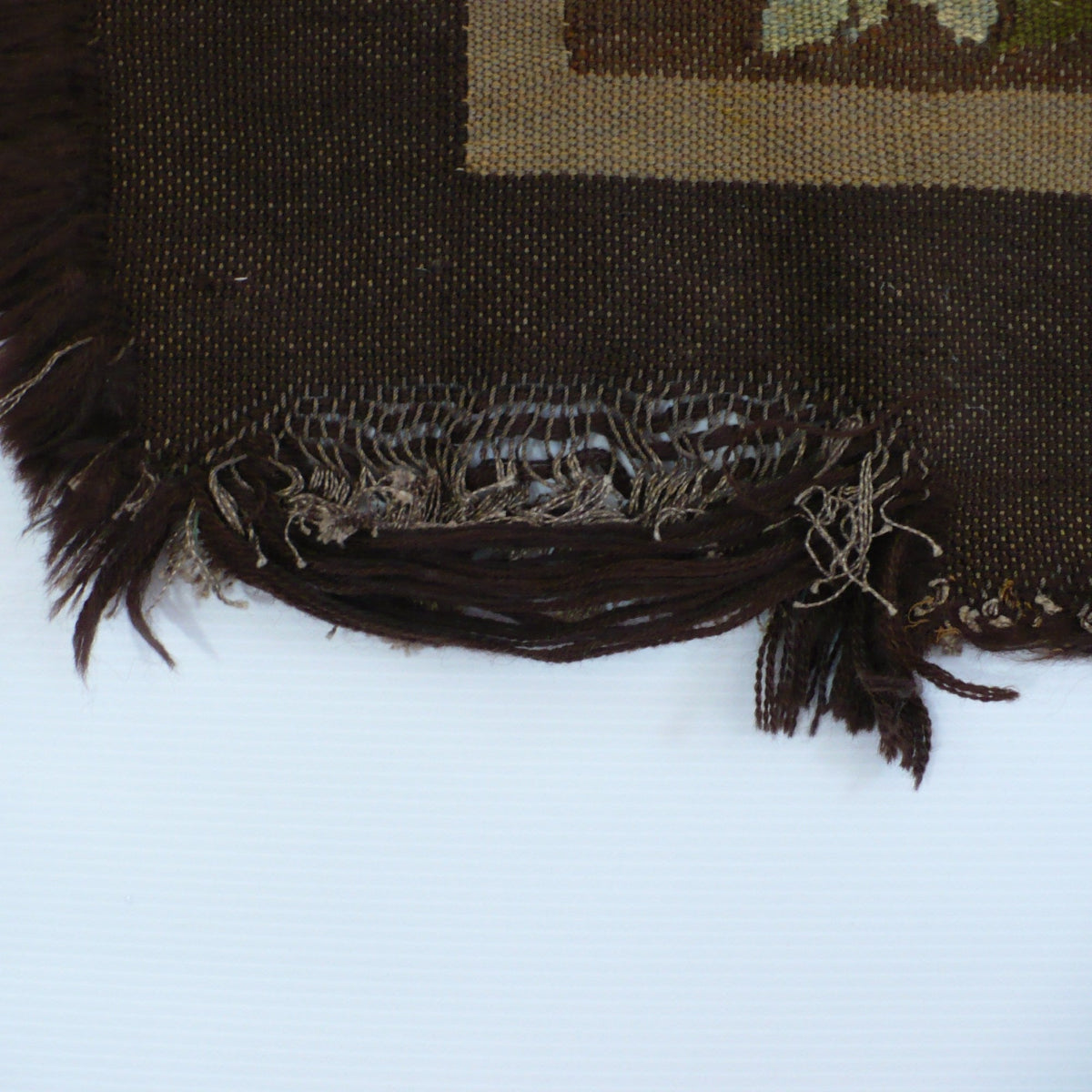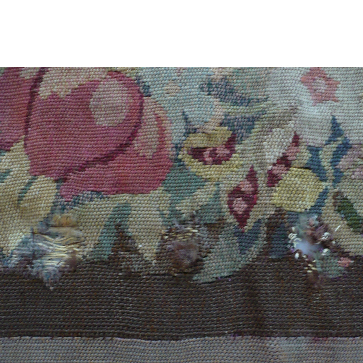 The wool has a substantial hand appropriate to a period woven furnishing. Wear, color softening, and structural irregularities are consistent with age and long-term use.