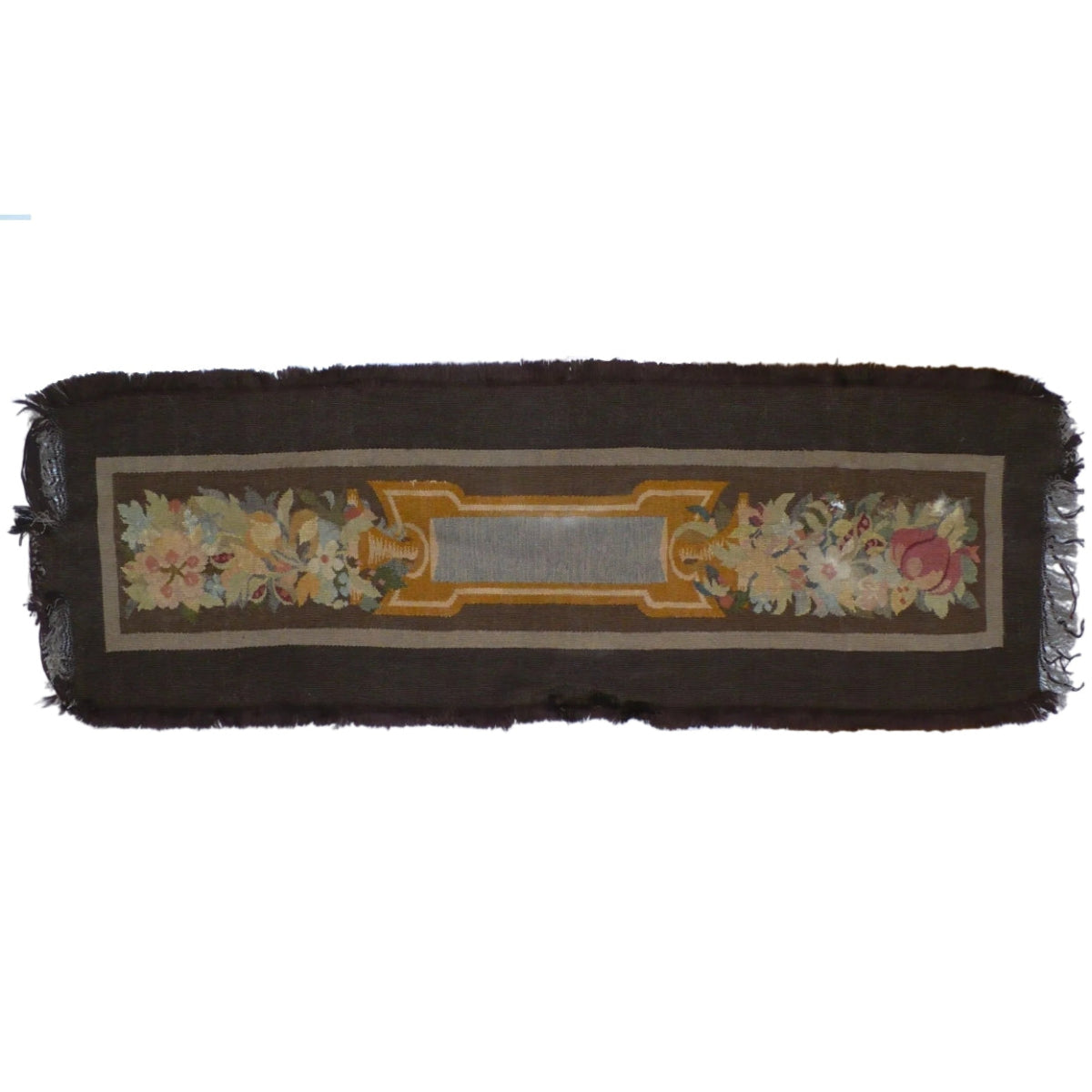 Handwoven wool table runner dating to the 19th century, exhibiting decorative motifs and overall composition associated with Aubusson-style French textiles. The design features floral panels at either end framing a central cartouche, rendered in a subdued palette consistent with Romantic and late Neoclassical tastes of the period.