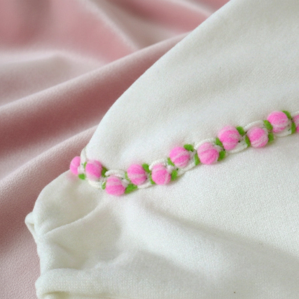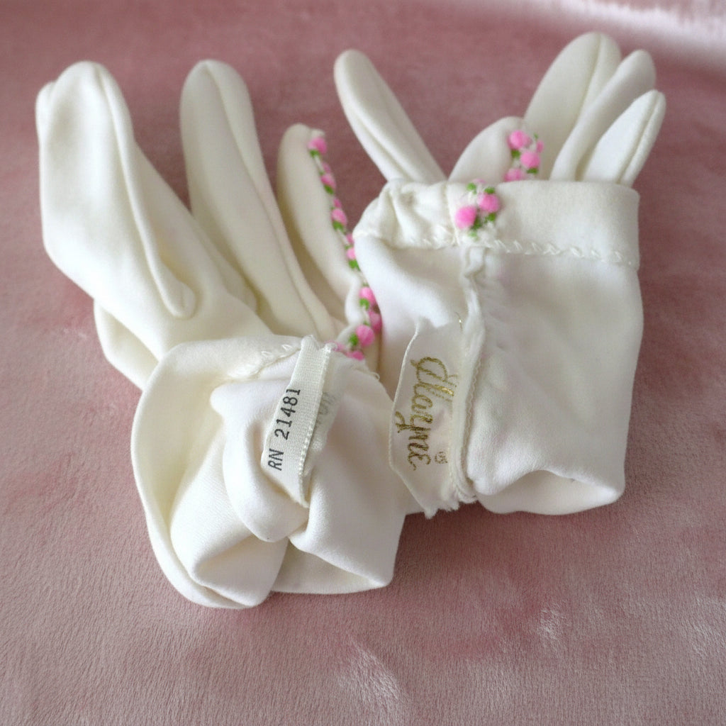 These sweet, vintage gloves are made from double-woven stretch nylon, offering a comfy and snug fit. They are decorated with embroidered cheerful, bright pink embroidered floral puffs. The fourchette fingers create a delicate, refined look, making them ideal for a Springtime outing or Easter Sunday church service.