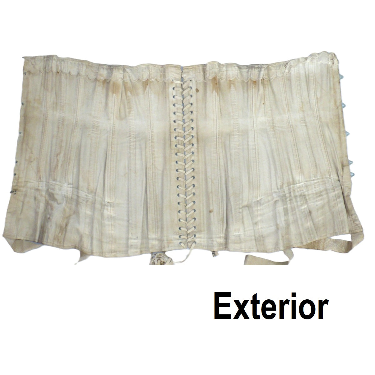 Condition: The fabric is still sturdy. Issues include stains, several steel stays poking through the interior, rusted fittings, and one missing button tab. Six of the twenty stays have broken through. A period repair is visible at the bottom of the fastening stain, padded to prevent the stay from damaging outer garments.