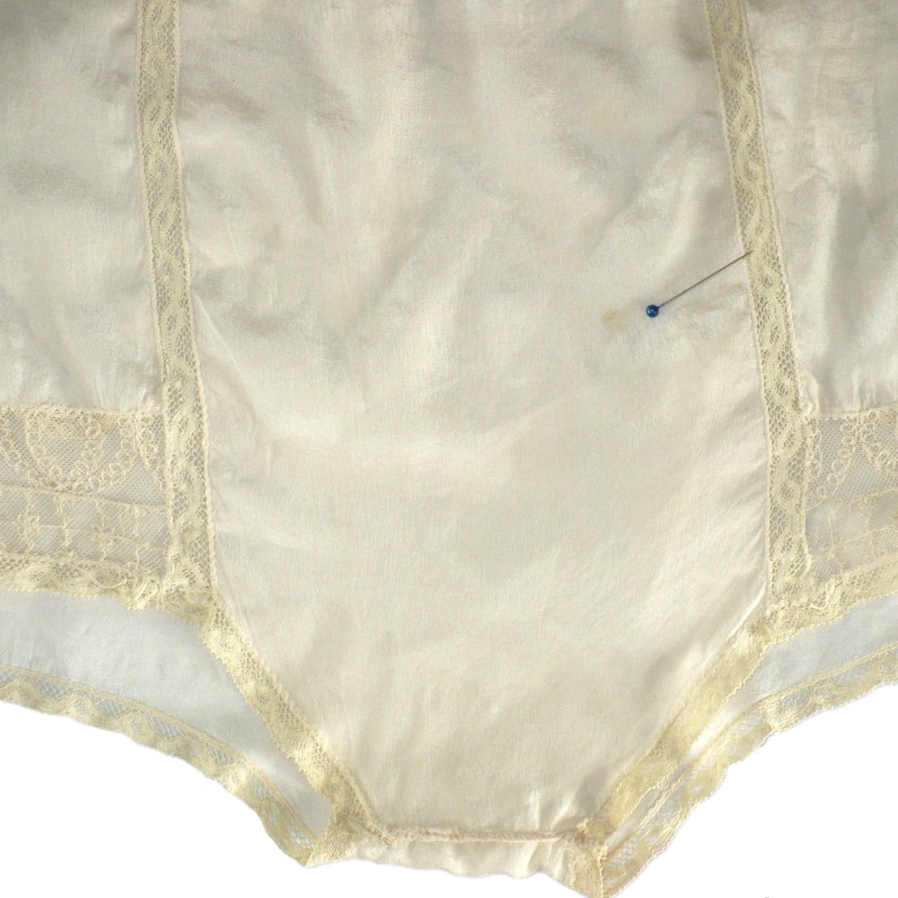1920s vintage bisque white silk Crepe de Chine panties, French Knickers, or tap pants have side slits trimmed with French needle lace. It's difficult to find these in this size!