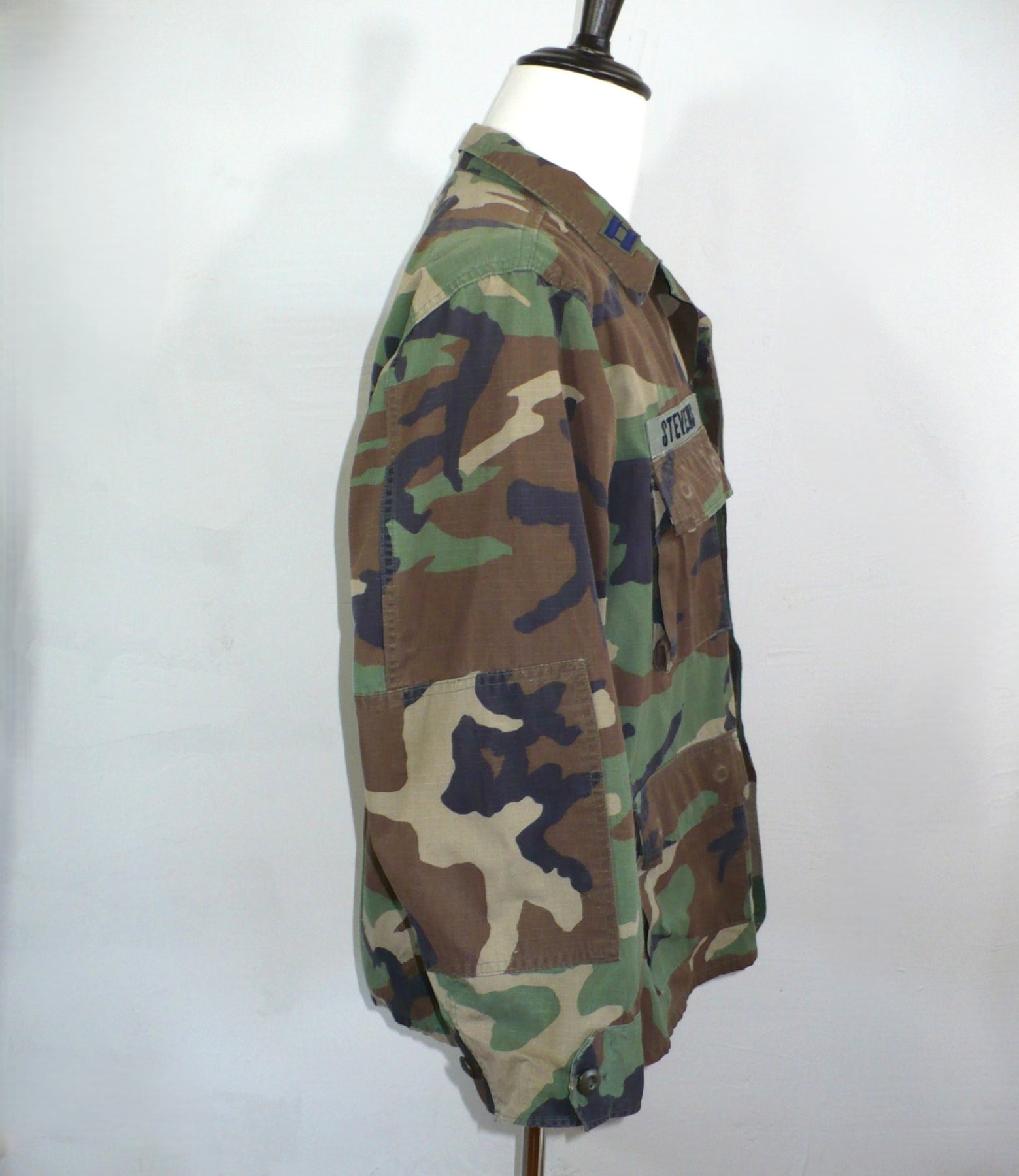 This camouflage jacket is a U.S. Air Force Battle Dress Uniform (BDU) in the M81 Woodland pattern, worn by Senior Master Sergeants. It was in service from 1981 to 2011.