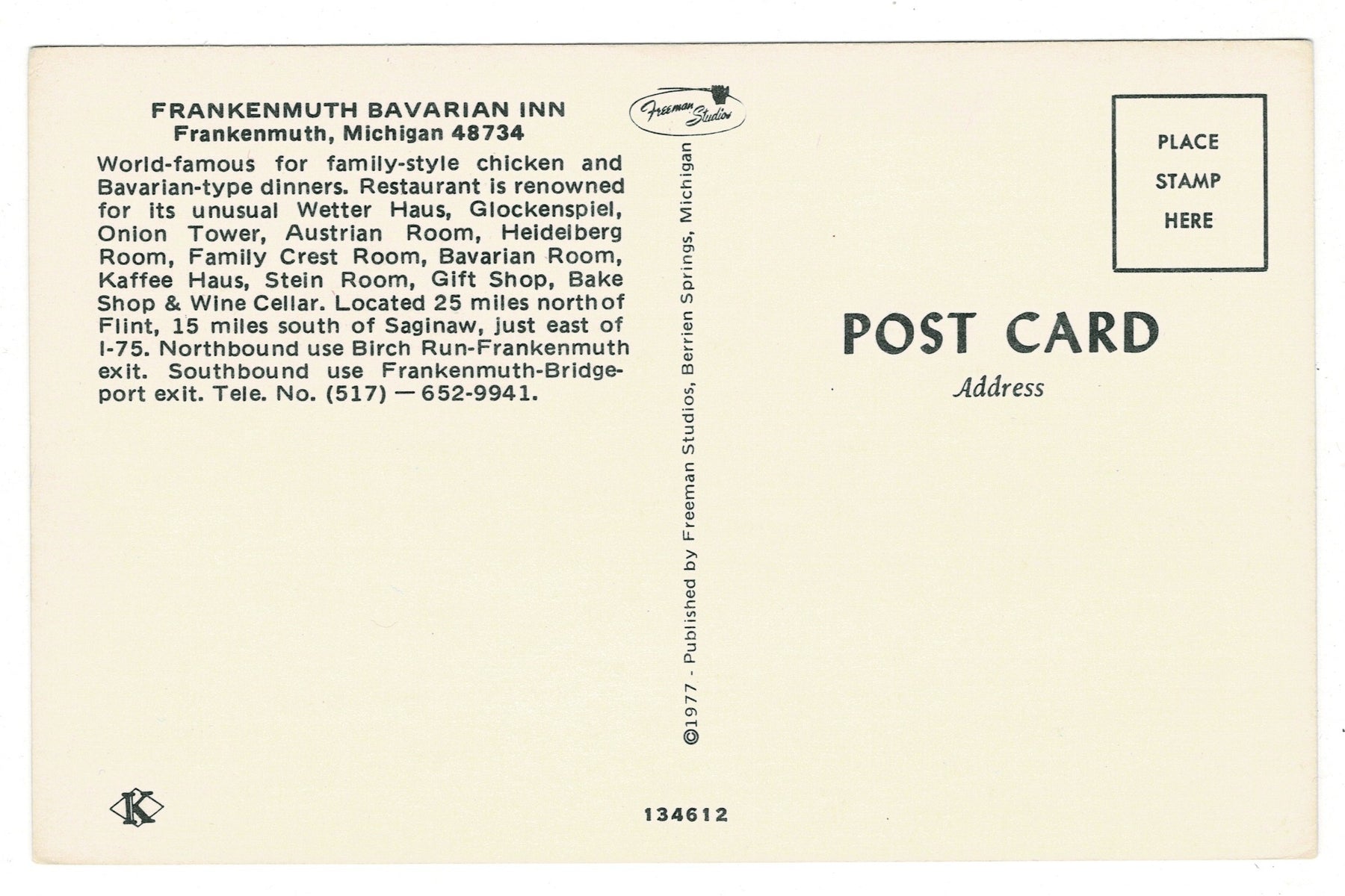 This postcard invites the viewer to imagine strolling along South Main Street, hearing the music of the carillon, smelling freshly baked pastries, and soaking up the unique Bavarian atmosphere that has made Frankenmuth a beloved destination for generations. It’s a perfect collectible for fans of architecture, culinary heritage, and mid-century Americana.