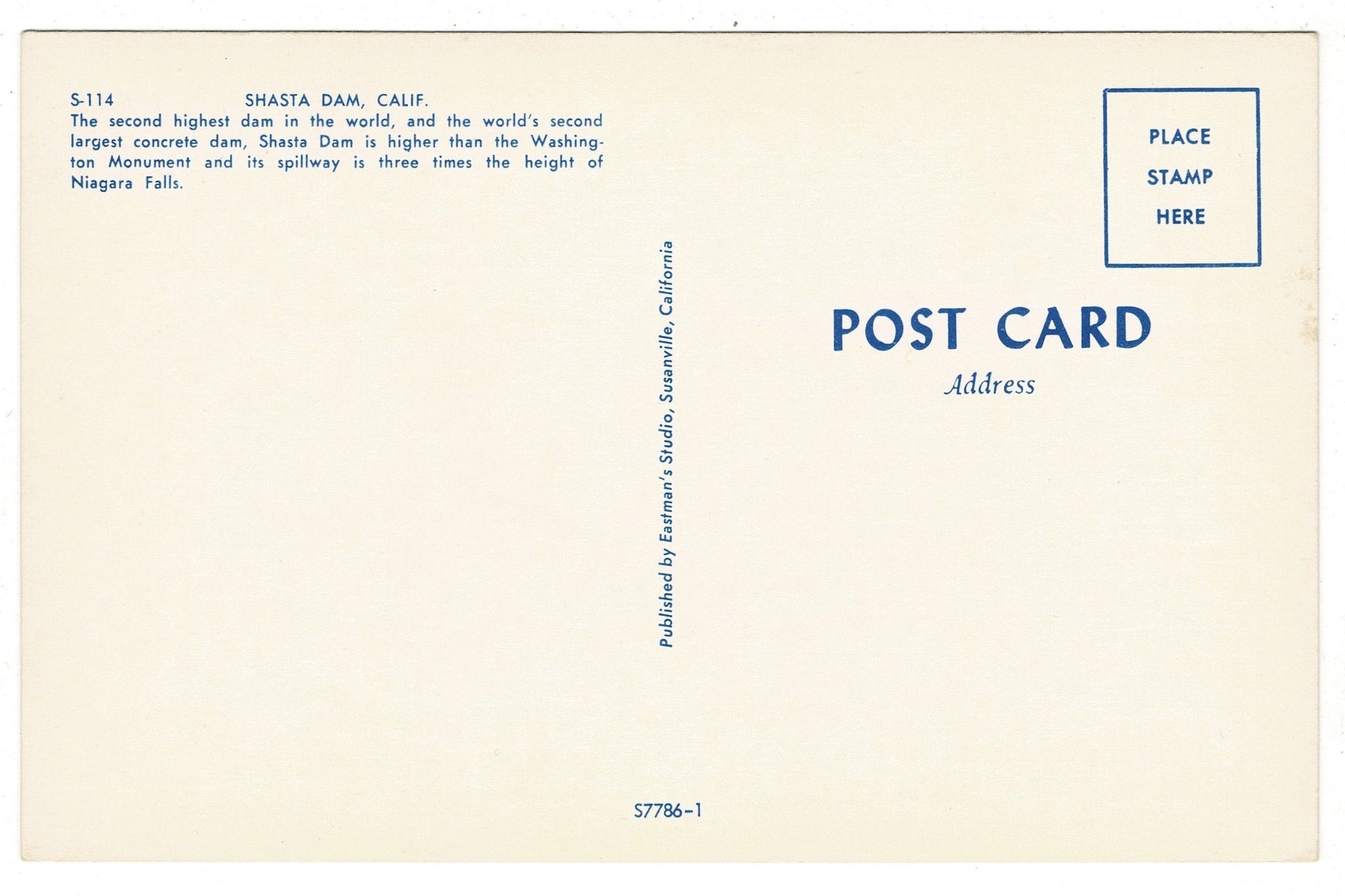 Published by Eastman’s Studio of Susanville, California, this postcard preserves the grandeur of Shasta Dam and the scenic expanse of Lake Shasta. It is perfect for framing or as a centerpiece in a collection of mid-century California landmarks, engineering marvels, or iconic American infrastructure.
