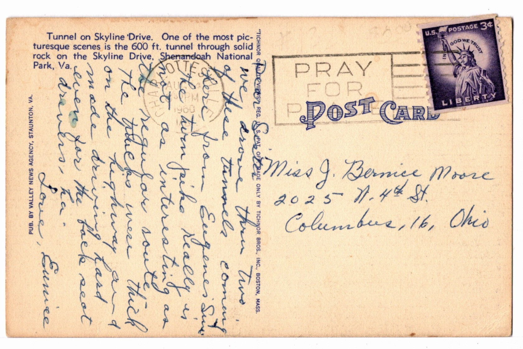 Postmarked 1960. Published by Valley News Agency of Staunton, Virginia, and also available through Tichnor Bros., Inc. of Boston, Massachusetts, this postcard preserves the beauty and significance of one of the park’s most memorable landmarks.