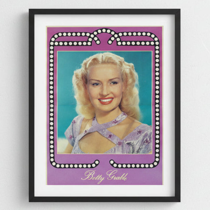 Original vintage Betty Grable magazine centerfold poster, measuring 16" x 11". Betty Grable was one of the most popular stars of 1940s Hollywood, celebrated for her musical film roles and her lasting influence on pin-up and popular culture. This authentic poster captures the charm and appeal that made her an enduring icon of the era.