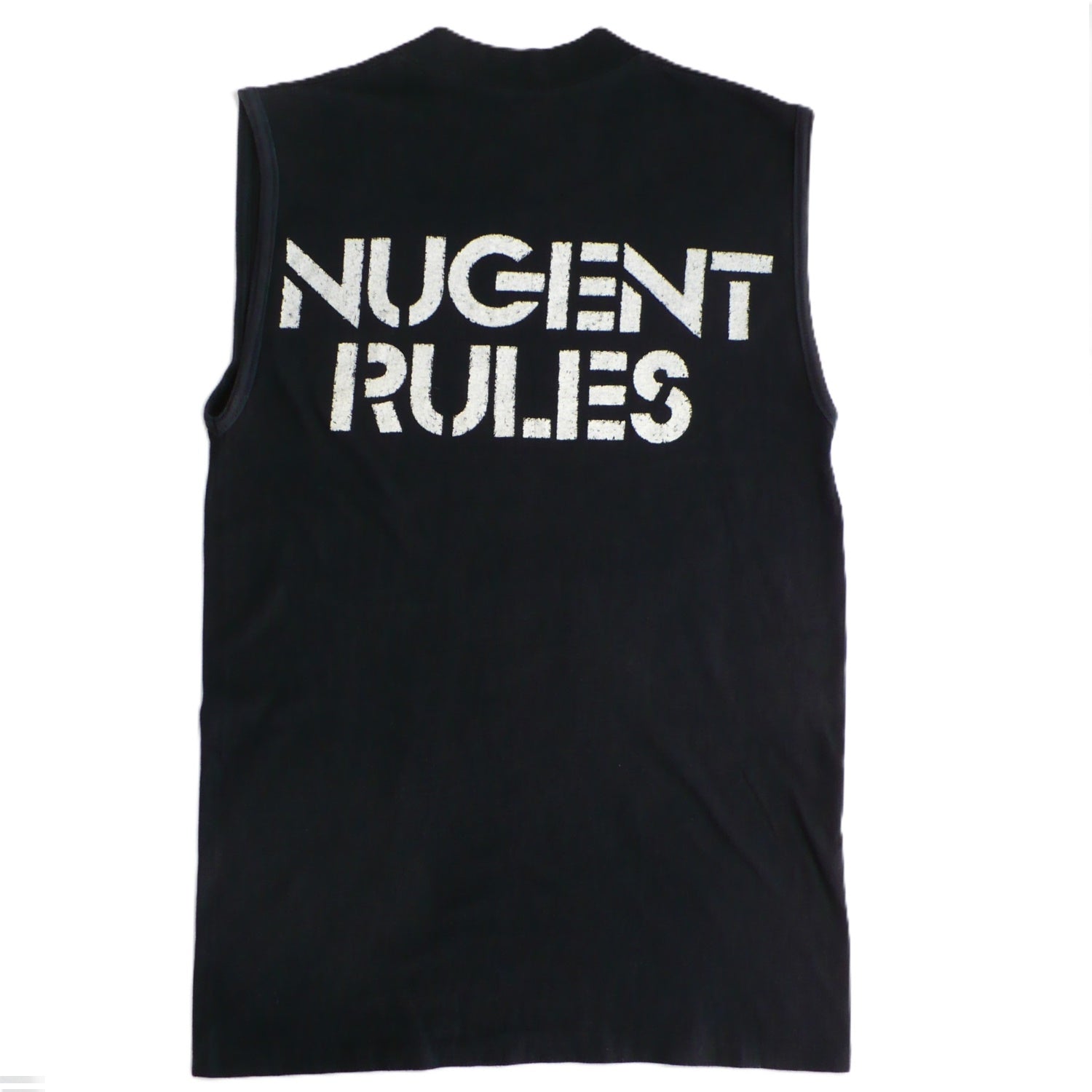 Step back in time with this rare 1982 Ted Nugent “Rules World Conquest Tour” shirt! This black sleeveless gem features “Ted Nugent” and logo stenciled in white on the front and “Nugent Rules” on the back. Originally purchased at the West Palm Beach Auditorium concert in Florida on September 26, 1982, this shirt is a true piece of rock history.