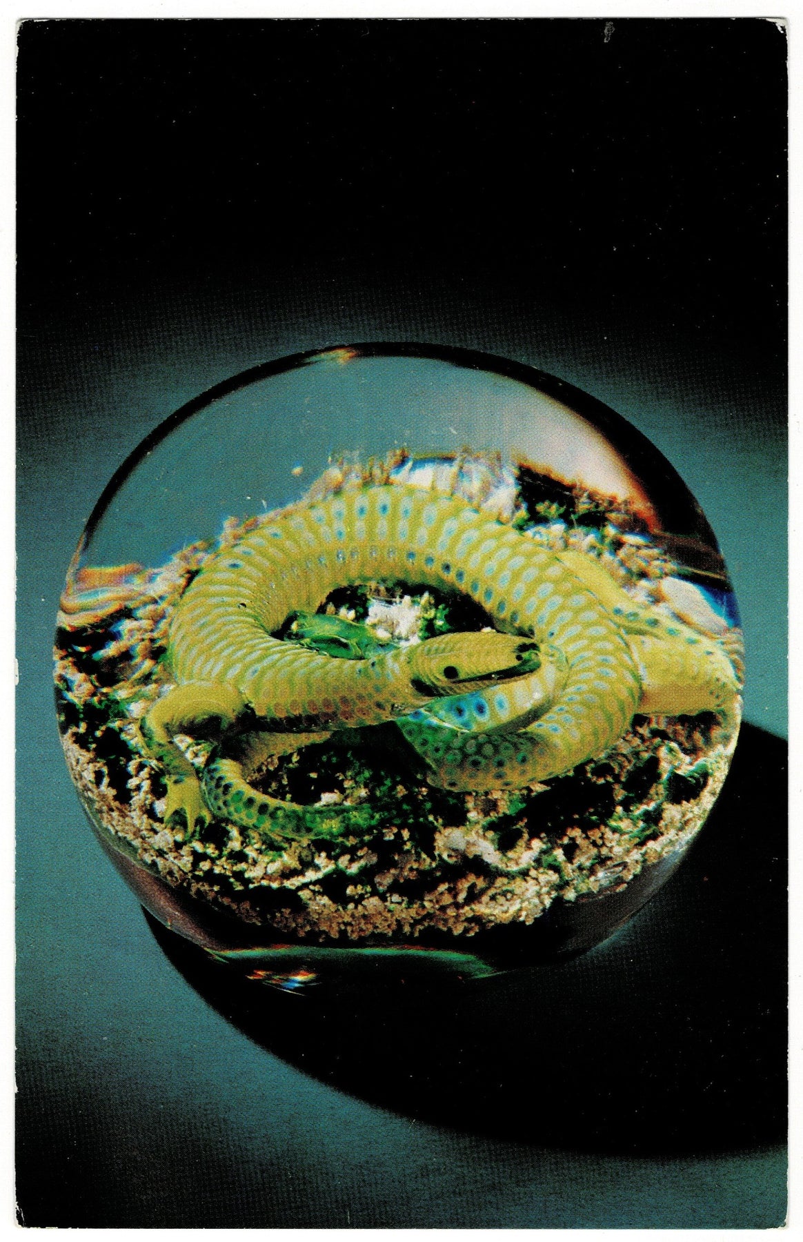 Enter the glittering world of 19th-century French glass artistry with this striking vintage postcard featuring a legendary masterpiece known as the Houghton Salamander. Suspended within a clear crystal dome, a lifelike yellow-green salamander coils in delicate detail, its body carefully shaped and textured to resemble living scales. Encased in molten glass without distortion or fracture, the creature appears almost magically preserved in time. In the 19th century, salamanders were believed to survive fire, making them a fitting and poetic subject for an object born of flame. This image captures not only beauty, but the wonder and mystery that made fine paperweights treasured works of art.