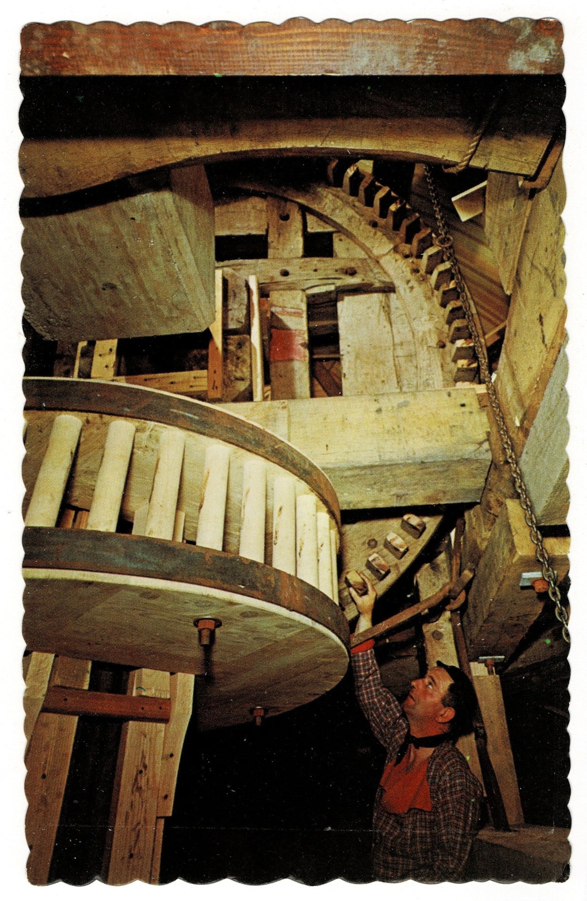 This vintage postcard offers a rare glimpse from the fourth level above the ground floor inside “De Zwaan” (The Swan) Windmill in Holland, Michigan, focusing on the massive main drive gears that bring this historic structure to life.