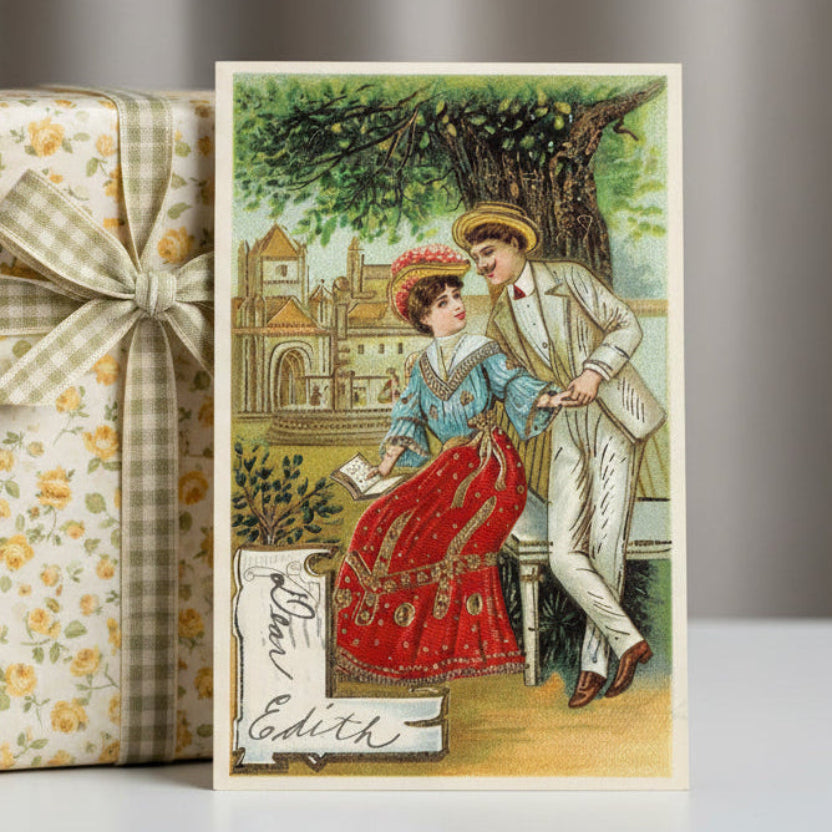 Step back in time with this exquisite 1906 vintage postcard! It features a distinguished gentleman with a prominent handlebar mustache engaging in conversation with an elegantly seated lady immersed in her reading. Set against the idyllic backdrop of a lush garden, this piece boasts intricate embossing and luxurious gilding that highlight its vintage charm.