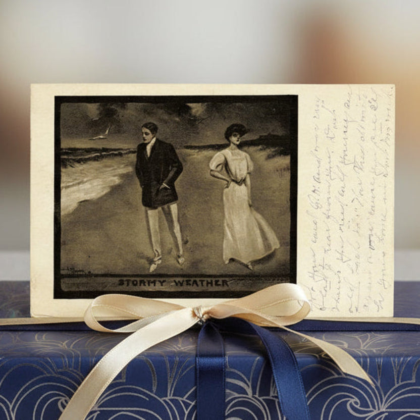 A fascinating postcard... The front image is a beautifully rendered, moody photogravure scene titled "Stormy Weather" at the bottom. It shows a stylish young couple in a lovers' quarrel on a dramatic beach at twilight. Crashing waves, dark stormy skies, and a lone gull overhead set the scene. The man, in a suit with hands in pockets, looks away. The woman, in a flowing white dress with arms crossed, is turned aside. They stand apart, capturing that classic Edwardian "not speaking" tension. The artwork is signed by the artist Louis Mayer (or Lou Mayer) in the lower left corner.