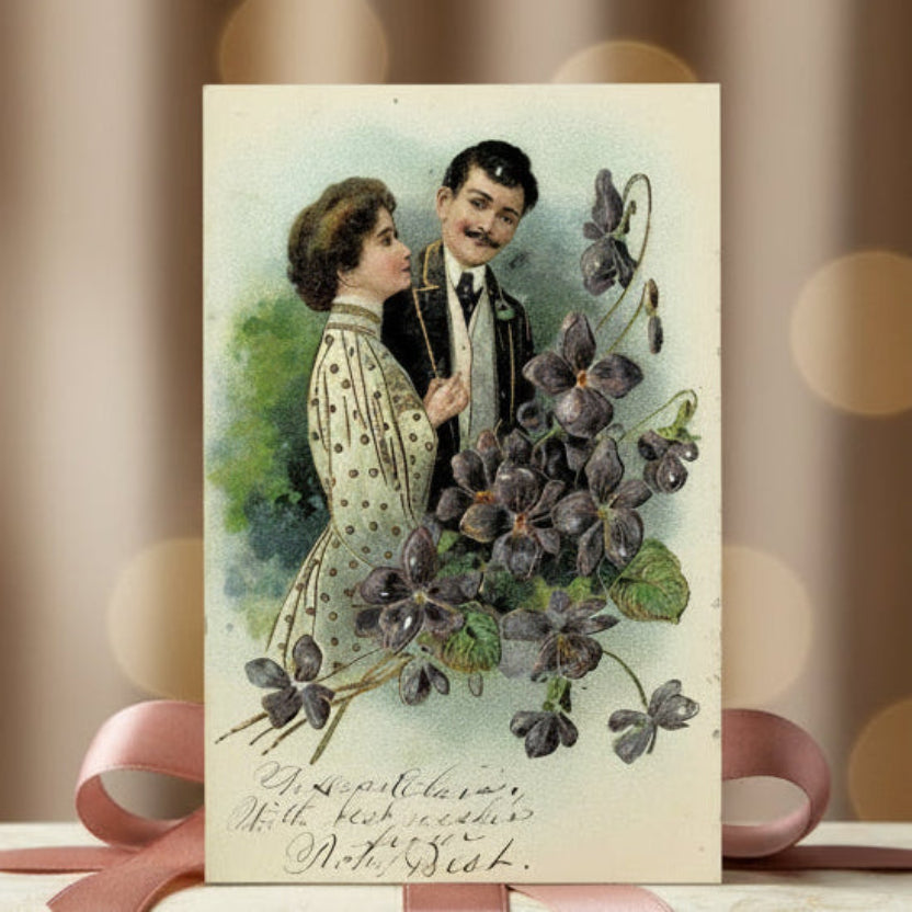 1908 vintage postcard. Gilded and embossed, this charming illustration shows a loving couple holding hands. She wears white with fine gilded accents highlighting its lace pattern. He dons a handlebar mustache and is in formal attire, wearing a three-piece suit with a white waistcoat. A violet is pinned to his lapel, and a spray of embossed violets is featured in the foreground, symbolizing faithfulness in the Victorian Language of Flowers. This would look great framed or make an excellent addition to any collection.