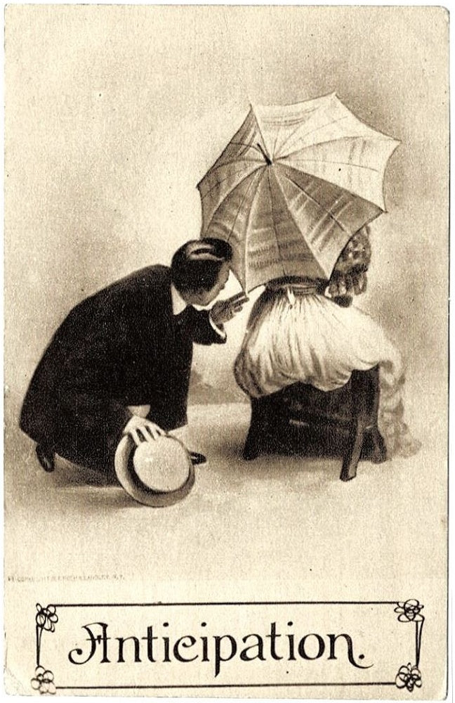 1910 vintage postcard. A well-dressed gentleman with a straw boater hat in hand is filled with the anticipation of seeing the lady hidden behind her striped parasol. "Anticipation" is so sweet when you know the best is yet to come. A charming vintage postcard.