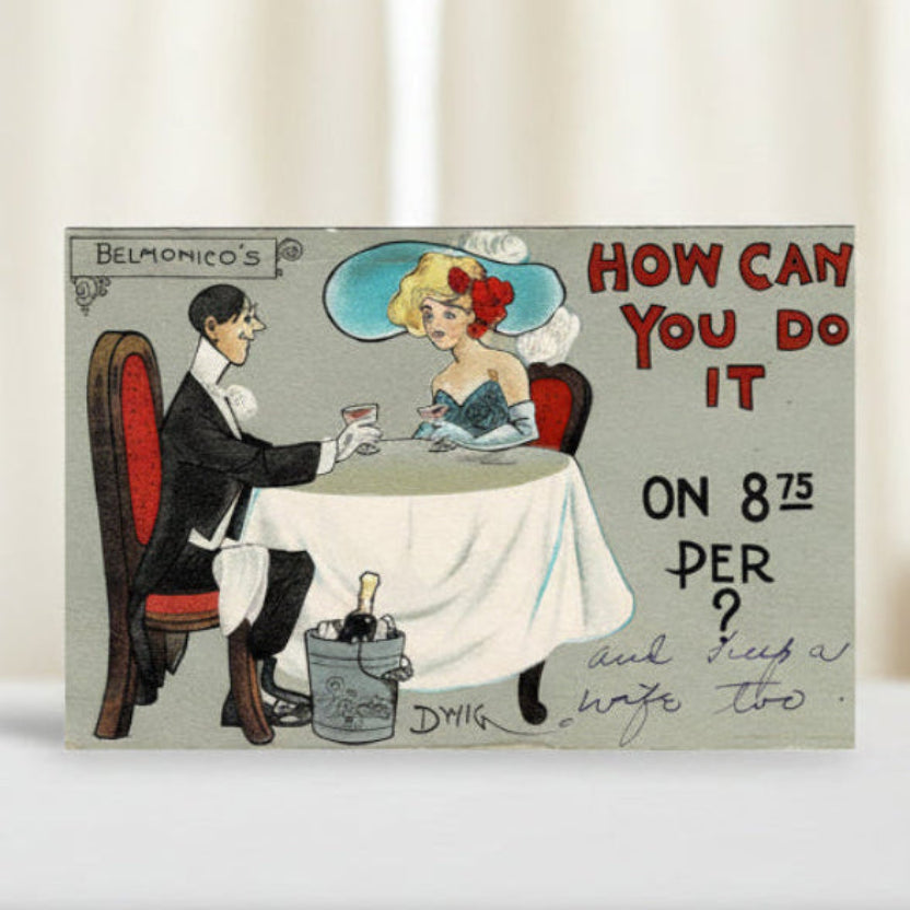 1910 vintage postcard. A man wearing tuxedo tails and a lady in a strapless gown and wide-brimmed hat drink champagne at Belmonico's. "How can you do it on $8.75 per? Handwritten below: "And keep a wife too". Artist signed DWIG (Dwiggins). This unique vintage lithograph postcard would look great framed and make an excellent addition to any collection.