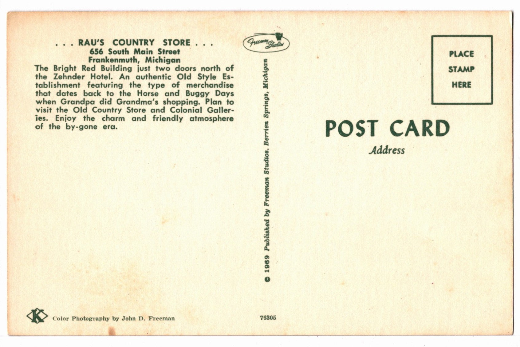 This postcard features color photography by John D. Freeman and was published in 1969 by Freeman Studios of Berrien Springs, Michigan. The image captures a vivid glimpse of a unique Midwestern destination that blended history, hospitality, and old-world charm into an unforgettable shopping experience.