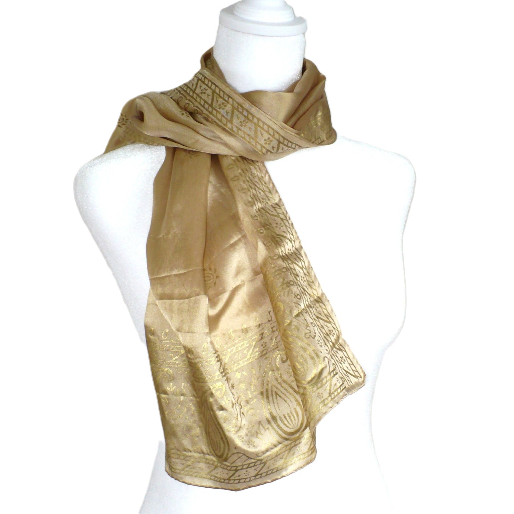 This vintage 1960s silk scarf is a rare and elegant find, perfect for collectors and those with an eye for timeless fashion. Made from richly weighted silk, it drapes beautifully and has a luxurious feel that speaks to the quality of its craftsmanship. The golden beige base is accented with metallic gold paisley detailing, adding a subtle shimmer that catches the light with every movement.