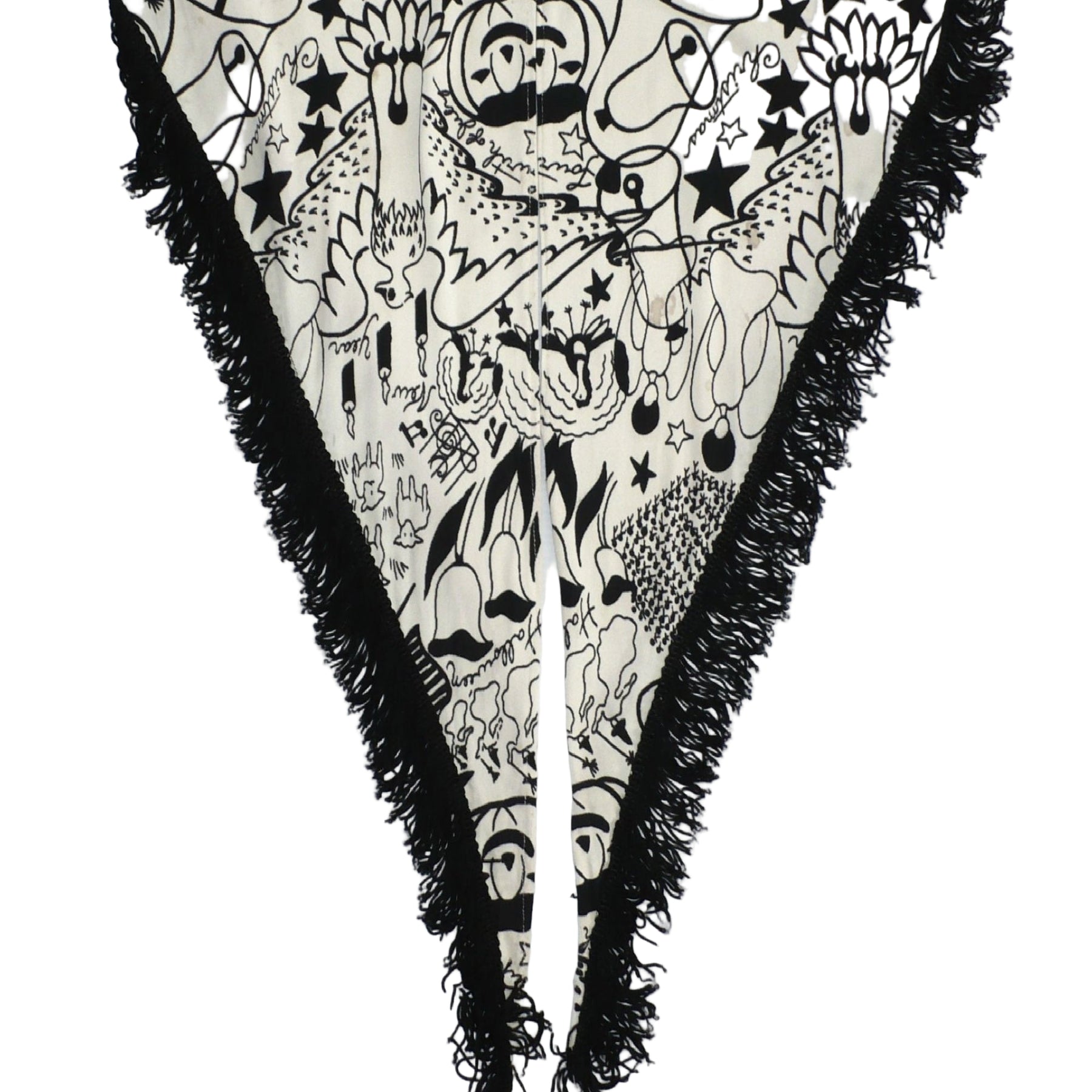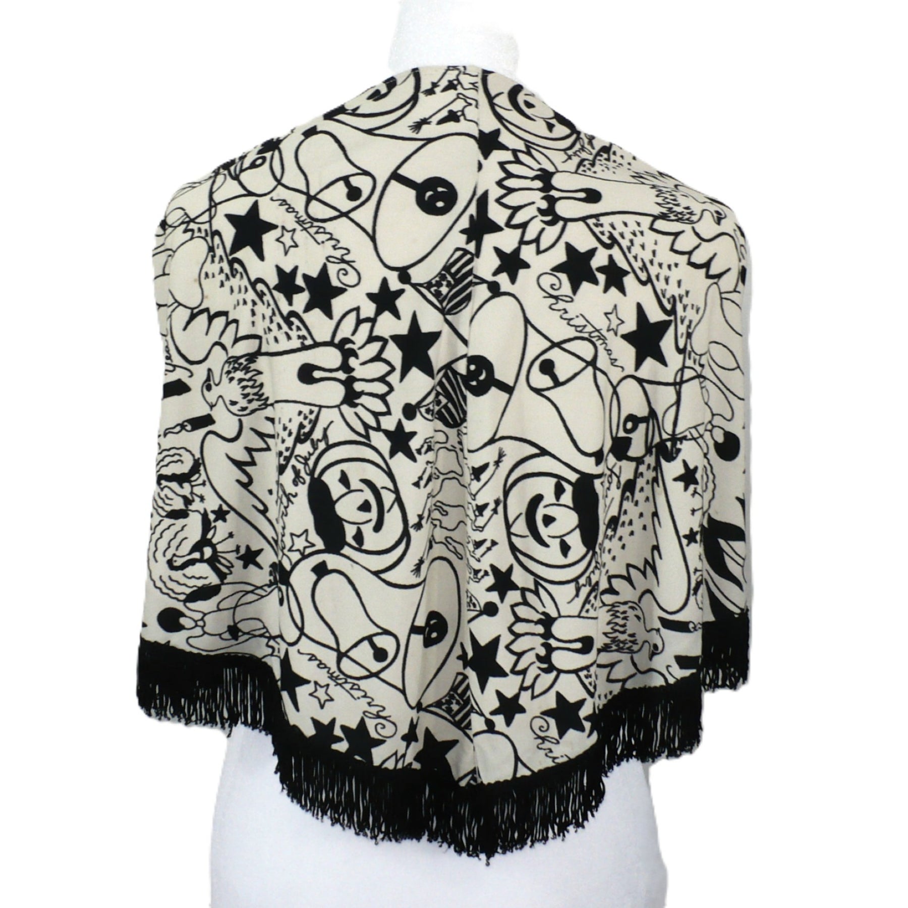 1960s Vintage Black Graphic Holidays Novelty Print Fringed Shawl.
