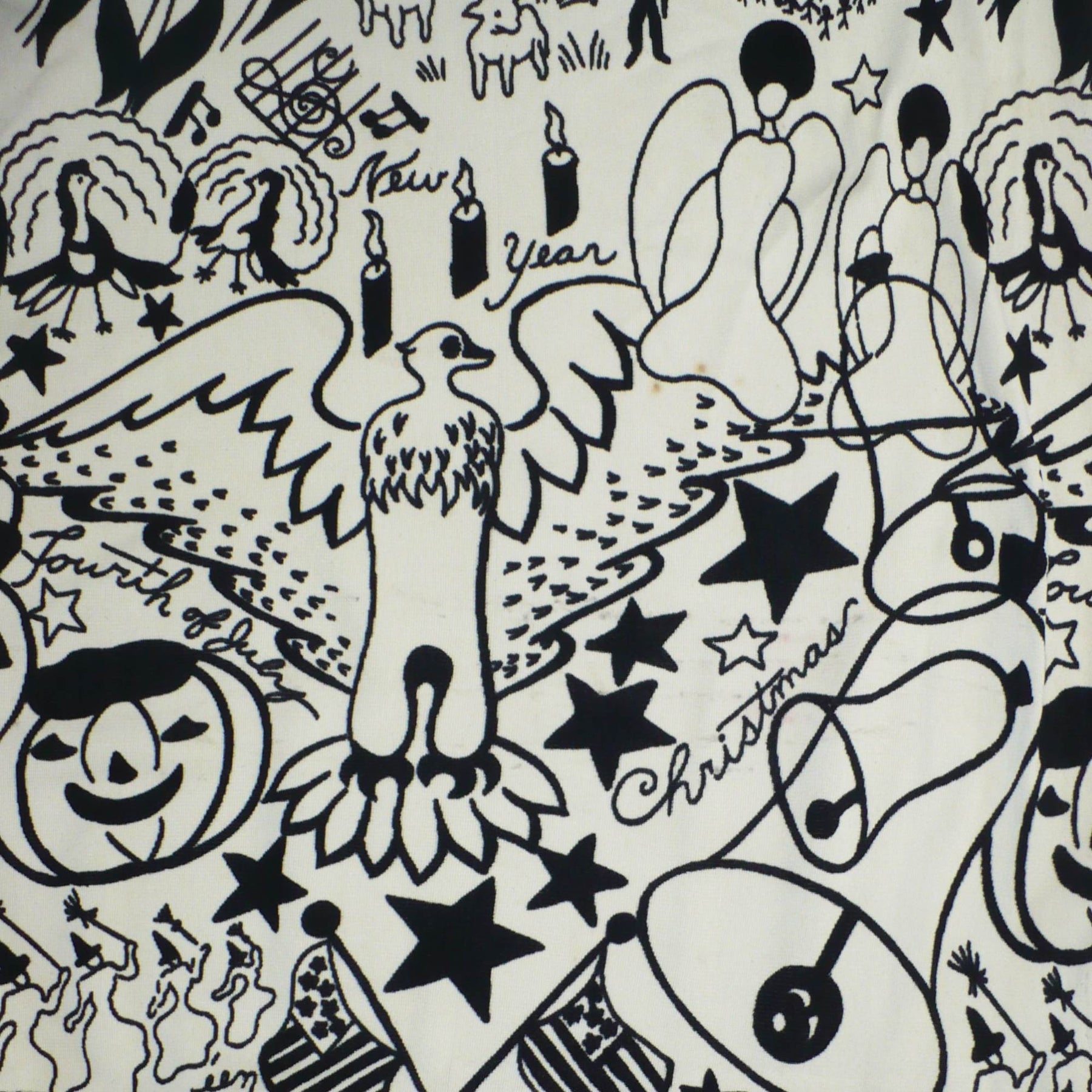 This novelty conversational print, 1960s-vintage jersey-knit shawl, is the perfect piece to add a playful, festive touch to your collection. With bold black graphics on a white background, the shawl features a fun mix of holiday-themed designs, including Halloween jack-o'-lanterns, pumpkins, witches, Christmas angels, bells, Hanukkah candles, "New Year" Thanksgiving turkeys, Decoration Day with a man waving a flag, "Fourth of July" stars, Easter sheep, tulips, and Spring flowers.