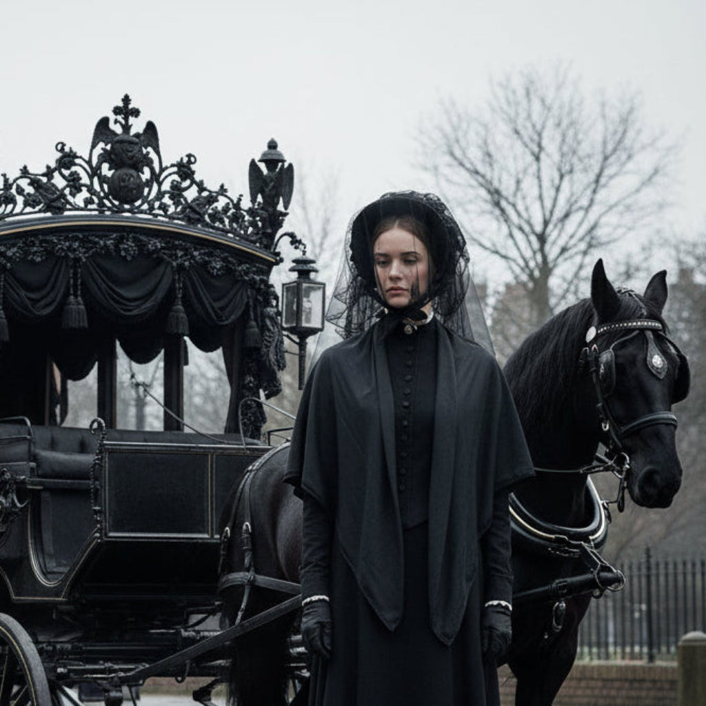 This wearable shawl exemplifies the refined restraint of the era’s mourning customs and would make a meaningful addition to any collection.