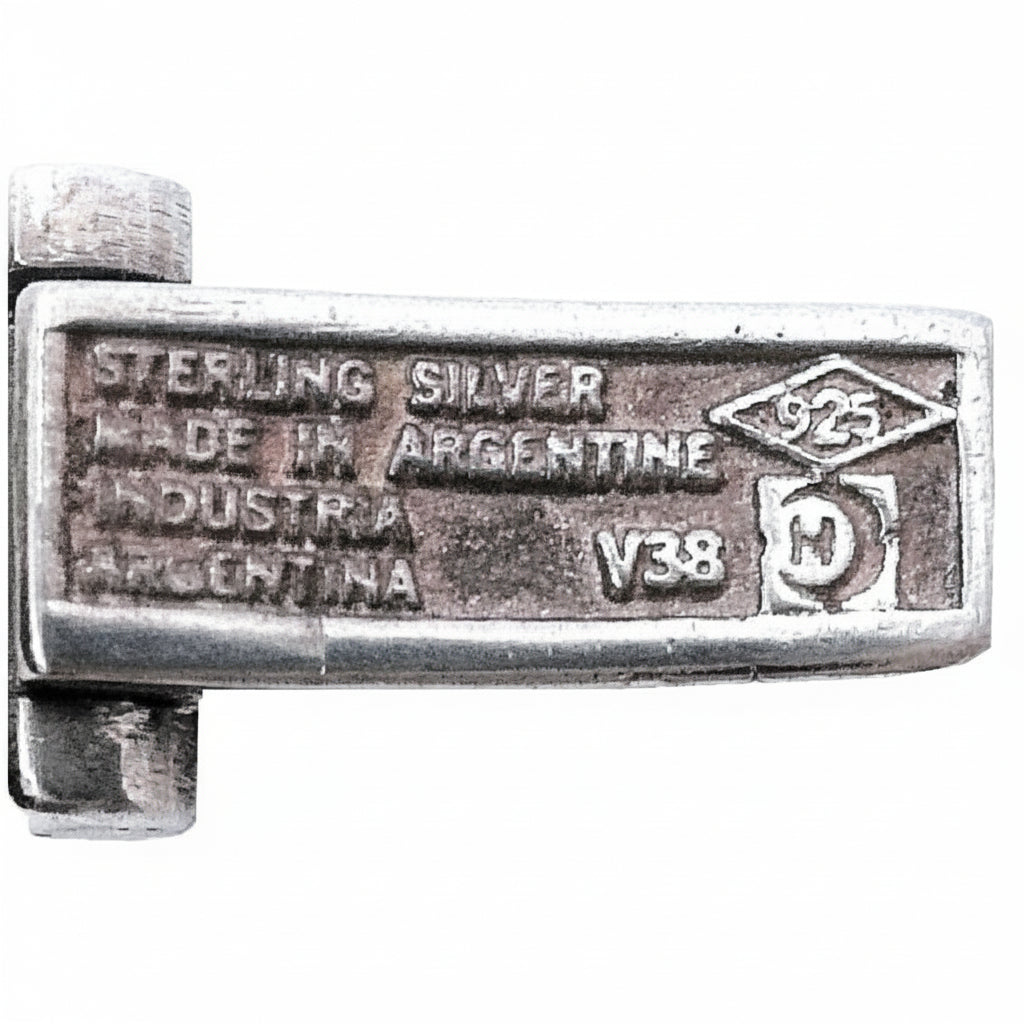 This vintage 1960s sterling silver bangle bracelet was made in Argentina and features a classic Charnière design. Four solid, polished silver panels form a smooth, comfortable fit around the wrist. The fold-over clasp has hidden grooves for added flexibility, ensuring both elegance and ease of wear. Stamped Industria Argentina and hallmarked 925 for sterling silver. A timeless and refined piece in excellent condition.