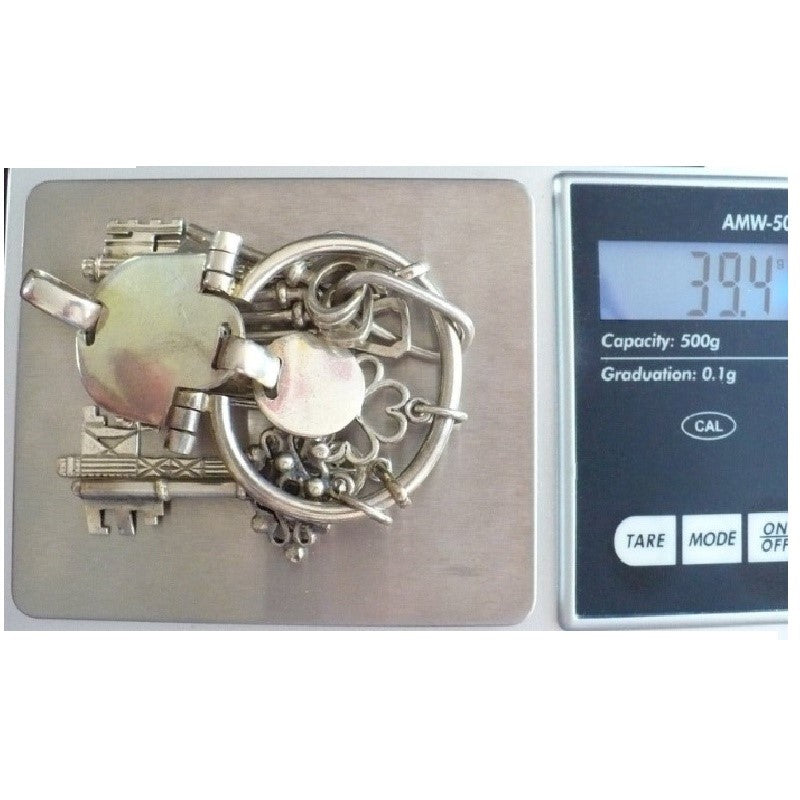 This vintage 1970s sterling silver chatelaine pendant features a collection of skeleton keys hanging from a hinged, doorknocker-style frame.