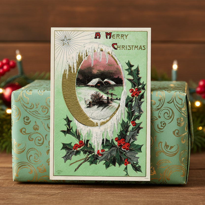 Step into a tranquil Christmas dusk of 1909 with this enchanting vintage postcard. The scene unfolds within a beautifully gilded oval frame, showcasing a snowy landscape where two cozy buildings stand surrounded by trees and a fence beneath a soft pink-tinged sky. Embossed icicles delicately hang from the top and bottom of the frame, catching the light like frozen jewels. Around the oval, vibrant holly leaves and bright red berries add a festive burst of color and tradition.