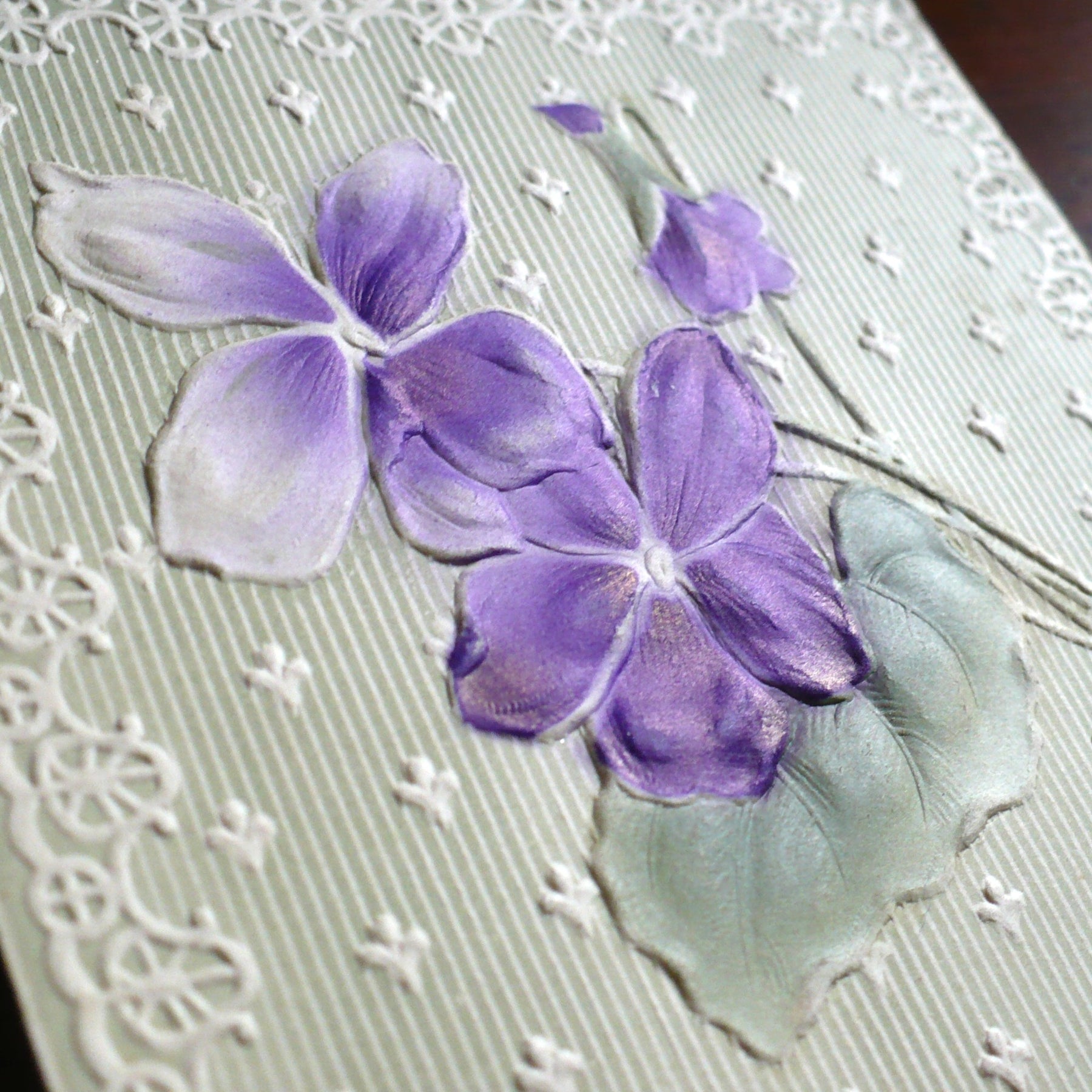 As precious as a pressed flower tucked in a cherished book, this 1909 vintage Christmas postcard brings quiet beauty to the season. Set against a pale green background that mimics white lace laid gently over cloth, rich purple pansies bloom with velvet softness. Their deep hues and tender faces carry a meaning once well-known in the language of flowers—pansies symbolizing loving thoughts and remembrance. Perfectly fitting for a holiday that draws hearts near, even across great distances.