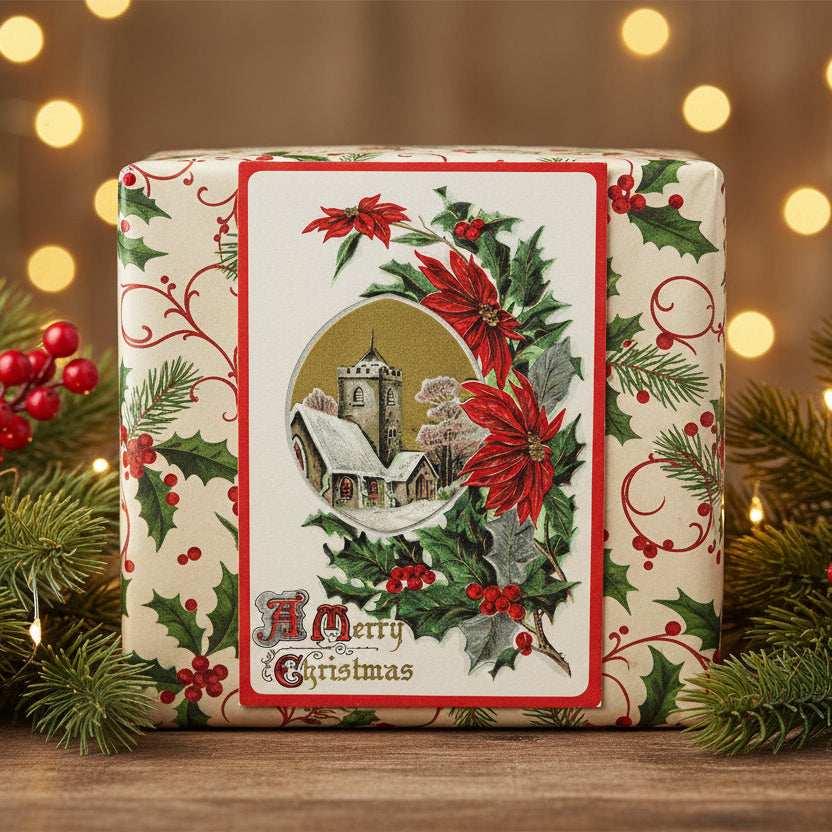 The phrase “A Merry Christmas” shines in beautifully illuminated script at the bottom left, embossed to give depth and texture that invites you to touch the season’s heartfelt greeting. This card captures the quiet reverence of Christmas, blending the spiritual comfort of the church with the joyous celebration symbolized by the festive flora.