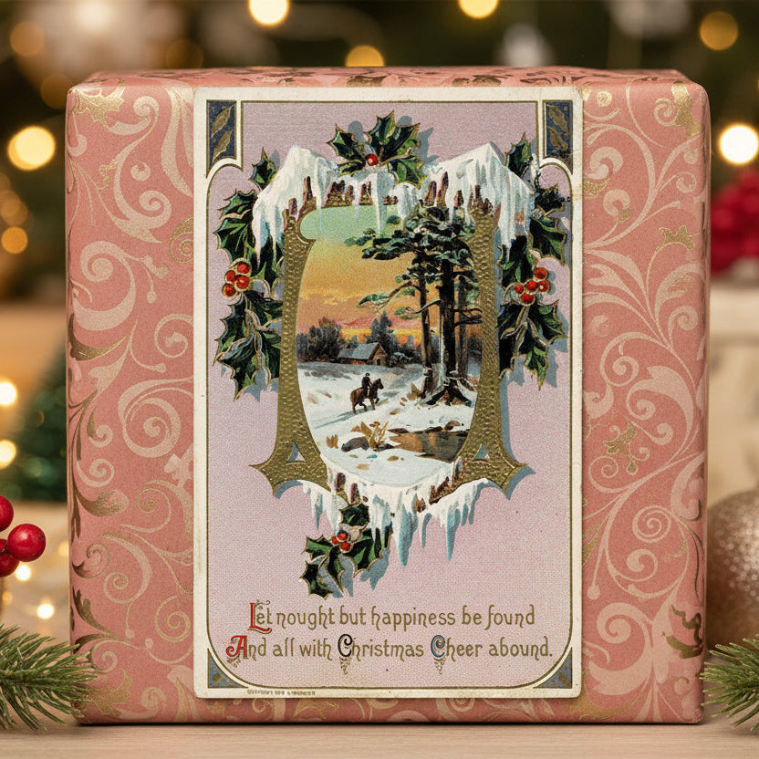 At the bottom, the heartfelt verse “Let nought but happiness be found And all with Christmas Cheer abound” reminds us of the simple joys and warm wishes that make the holidays truly special. This card blends artistry and sentiment to transport you to a timeless winter moment filled with hope and cheer.