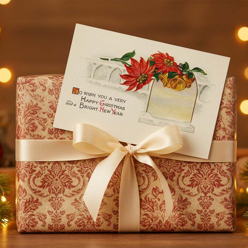 There’s something instantly nostalgic about a poinsettia at Christmastime—those velvety red petals and deep green leaves calling to mind cozy parlors, handwritten notes, and the quiet beauty of winter days gone by. This original 1916 Christmas and New Year postcard captures that sentiment with elegance and warmth. Two radiant red poinsettias bloom beside golden bells, their colors vivid against a crisp white background. The heartfelt greeting, “TO WISH YOU A VERY HAPPY CHRISTMAS and a BRIGHT NEW YEAR,” is rendered in a graceful early 20th-century typeface, evoking a time when holiday wishes traveled slowly but meant more.