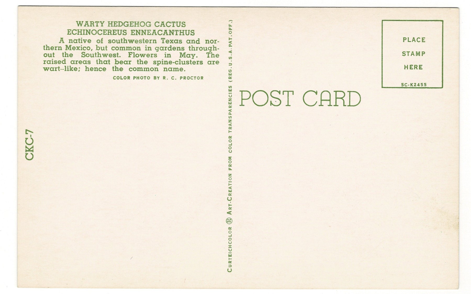 Native to southwestern Texas and northern Mexico, this cactus is also commonly grown in gardens across the American Southwest. Photographed in vivid color by R.C. Proctor and reproduced using CurteichColor art from color transparencies, the postcard preserves both the dramatic form of the cactus and the vivid hues of its blooms, making it a striking collectible for lovers of Southwestern flora, desert landscapes, and mid-century botanical postcards.