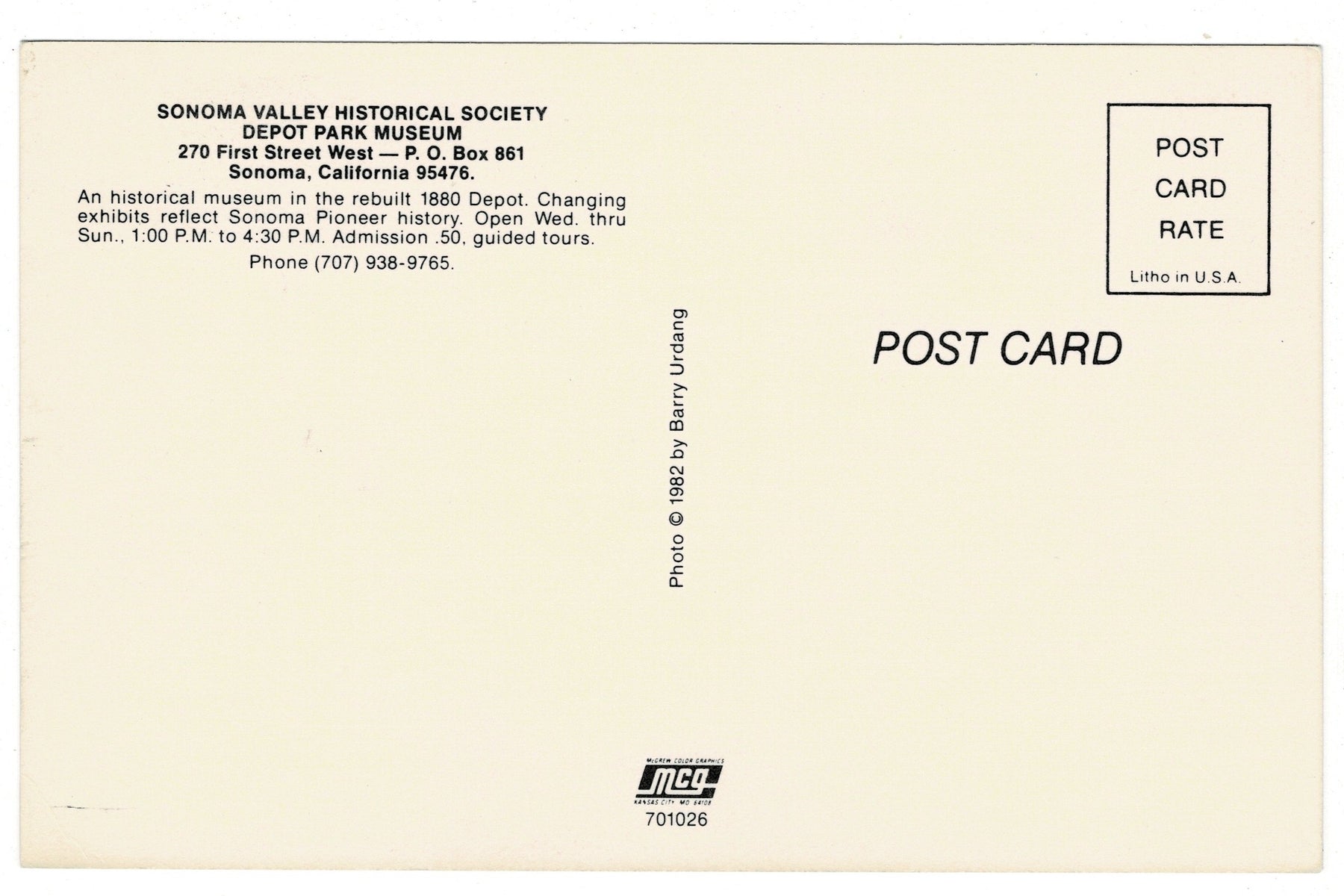 Photographed in 1982 by Barry Urdang, a skilled documentarian of California’s historical sites, this image reflects the museum’s dedication to preserving and sharing local history. The Depot Park Museum houses changing exhibits that showcase quilts, model trains, historic resorts, and other artifacts of Sonoma Valley life, offering visitors a hands-on experience of the region’s cultural and transportation legacy.
