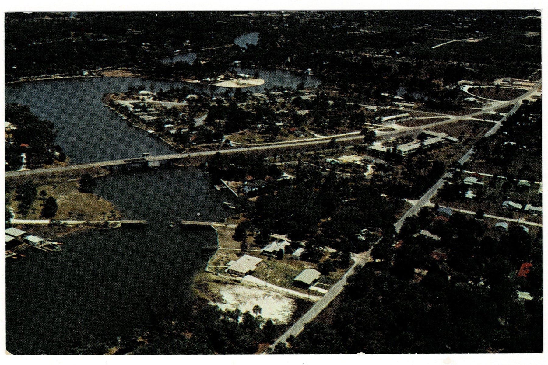 The aerial view highlights the sparkling river below and the tidy waterfront homes and marinas that defined this growing coastal community. The concrete bridge, modern for its day, symbolized progress and connection, linking small-town Florida with the excitement of travel and discovery.
