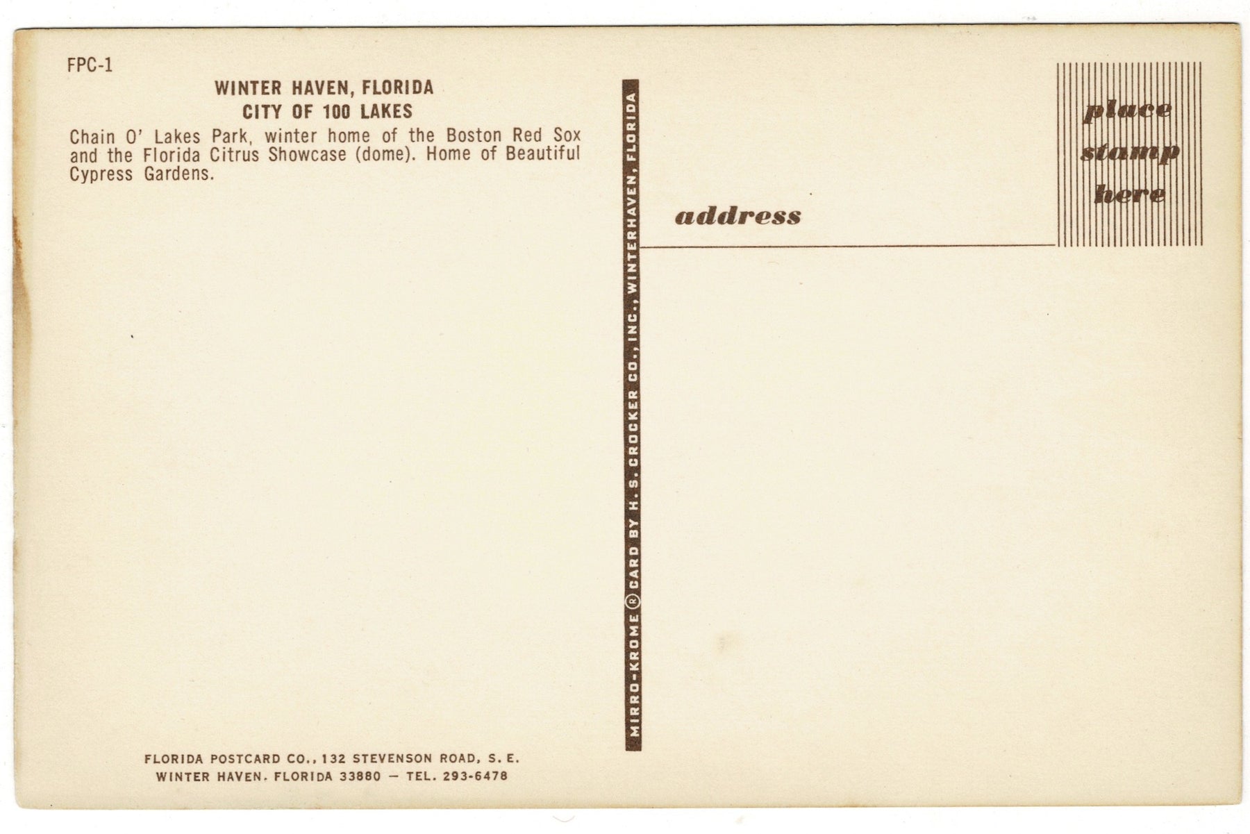 The postcard was produced by H. S. Crocker Co., Inc., and distributed through the Florida Postcard Co. of Winter Haven, a testament to the collaborative work that shared this local landmark far beyond its hometown.