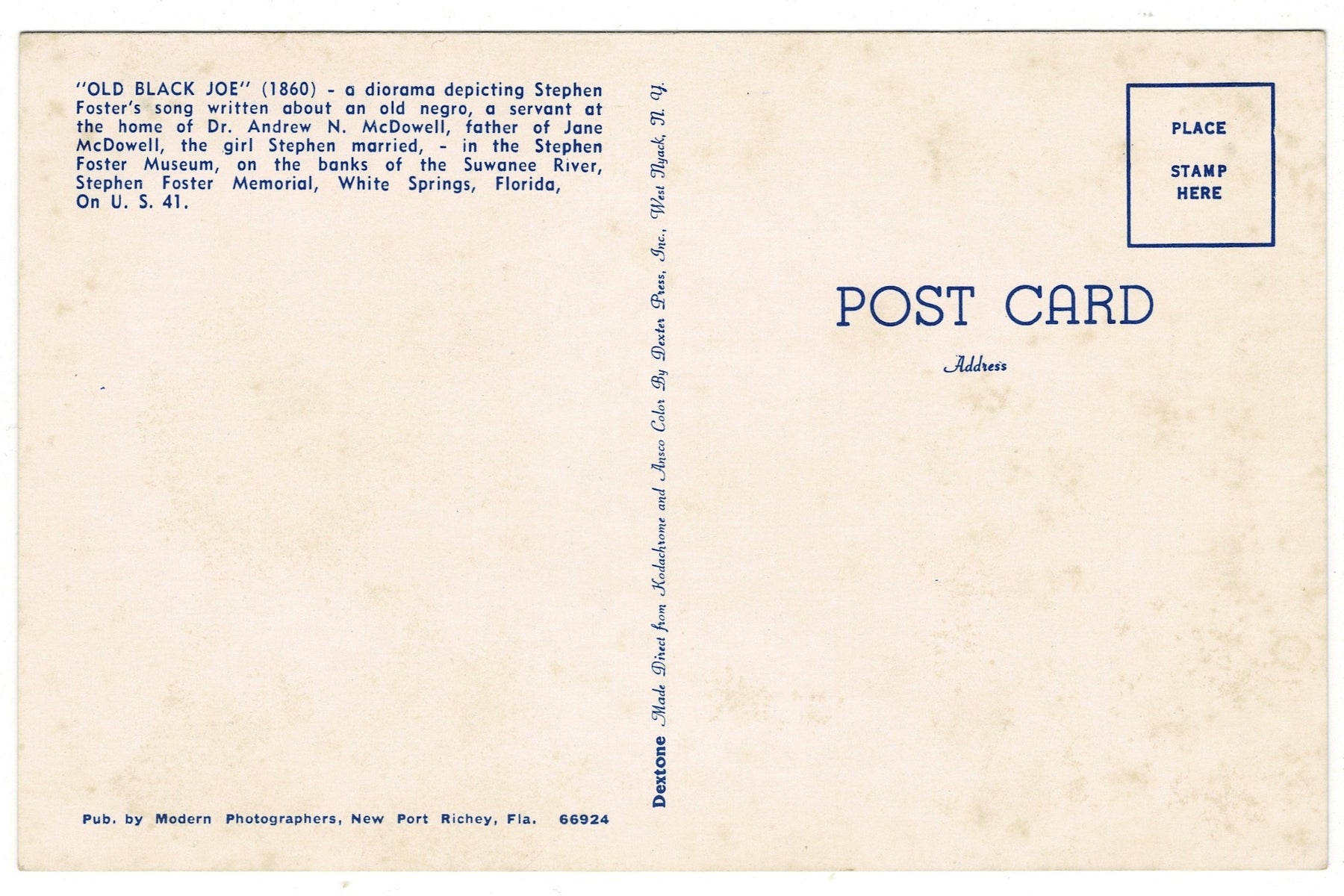 Step into a piece of musical and cultural history along the banks of the Suwanee River in White Springs, Florida. This vintage postcard features the “Old Black Joe” diorama, inspired by the 1860 song written by Stephen Foster. The large-scale display, measuring six by nine feet at one-sixth scale, portrays a scene drawn from the sentimental ballad, visualizing the aging servant figure at the heart of Foster’s lyrics. The exhibit was housed at the Stephen Foster Memorial on U.S. 41, where visitors explored the life and legacy of one of America’s most influential 19th-century songwriters.