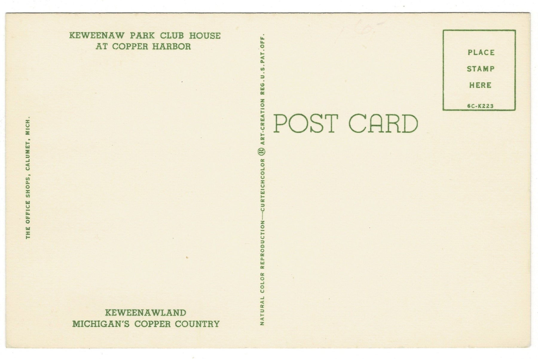 Step into the rugged beauty of Michigan’s Copper Country with this vintage postcard depicting the Keweenaw Park Club House in Copper Harbor. Nestled amid the scenic landscapes of Keweenaw County, the lodge’s rustic log cabin architecture evokes the charm of early 20th-century park retreats, blending naturally with the surrounding forests and shoreline. The postcard captures the building’s welcoming facade and outdoor setting, offering a glimpse into the recreational life and natural splendor of the region.