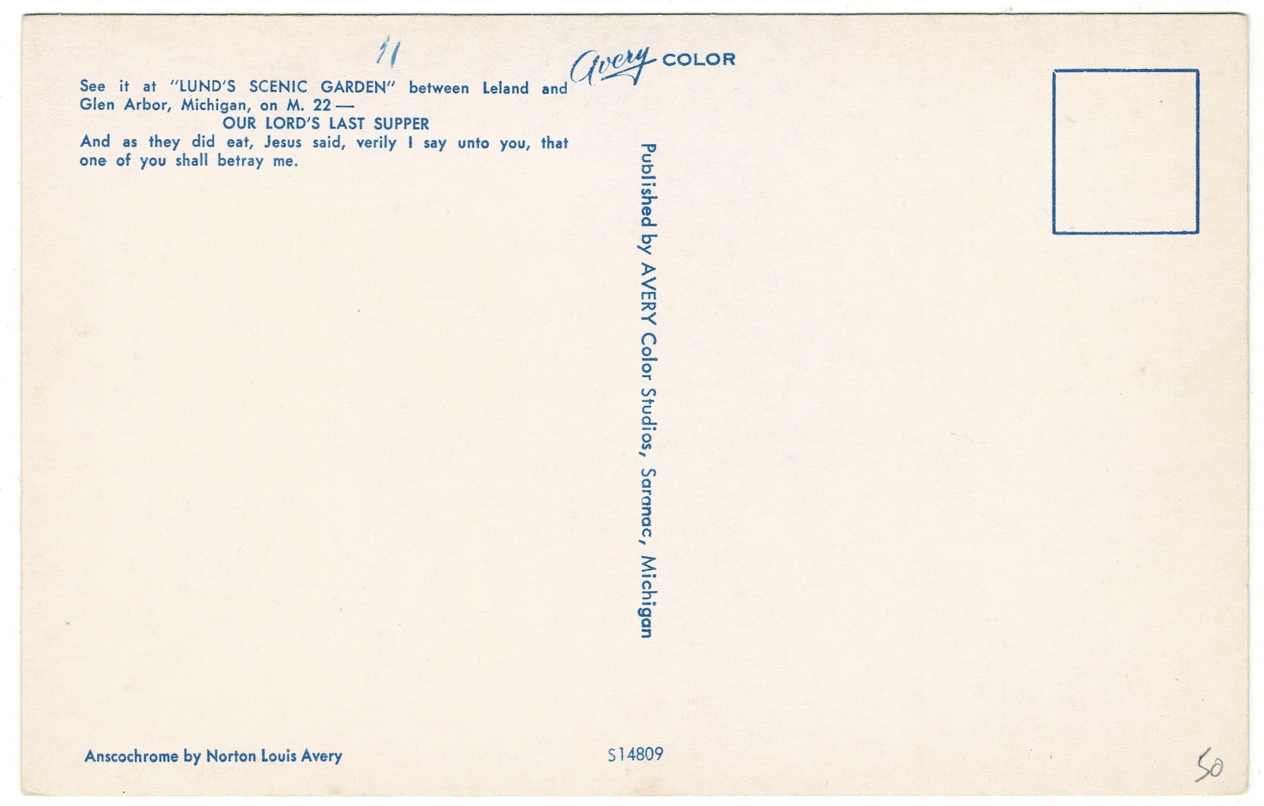 Published by Avery Color Studios in Saranac, Michigan, this postcard was printed using the Anscochrome process, prized for its vivid, enduring colors. Produced in the 1950s during the height of the chrome-era postcard era, it preserves a rare glimpse of mid-20th century religious “living scene” artistry.